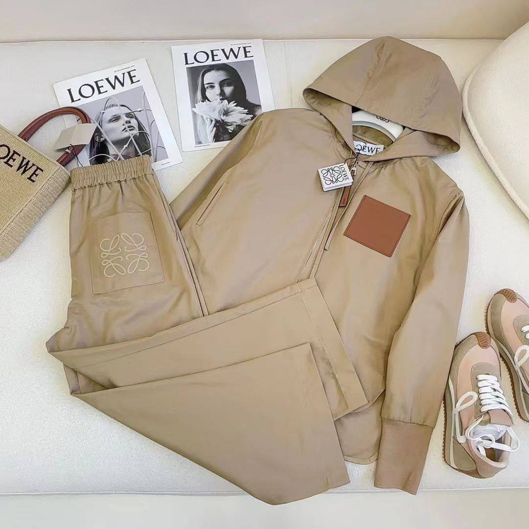 Костюм женский Loewe LUX-94907 – это стильный спортивный костюм в современном стиле. Комплект состоит из куртки с капюшоном и брюк, выполненных в песочном цвете с деталями из кожи. Этот костюм подойдет для повседневной носки, прогулок и активного отдыха.