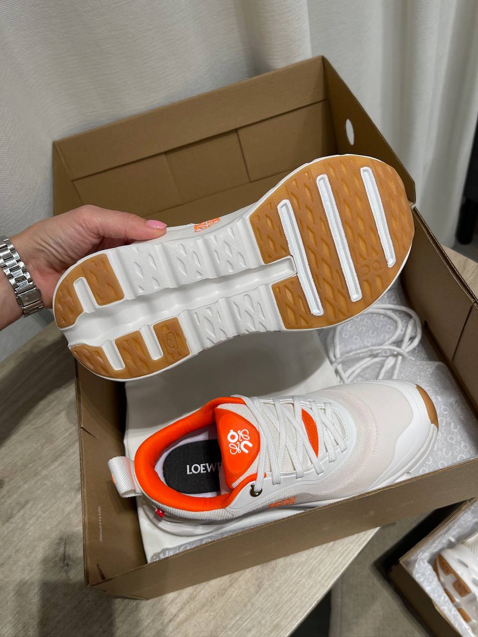 Кроссовки Loewe – это стильная и комфортная обувь, идеально подходящая для активного образа жизни и создания ярких образов. Белый цвет верха в сочетании с оранжевыми деталями придает модели свежий и современный вид.
