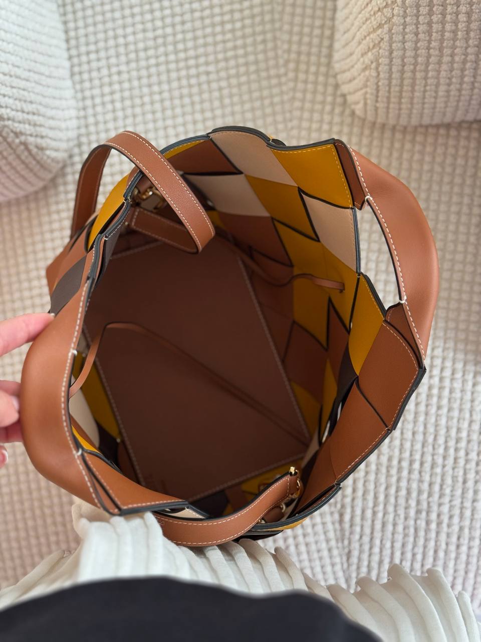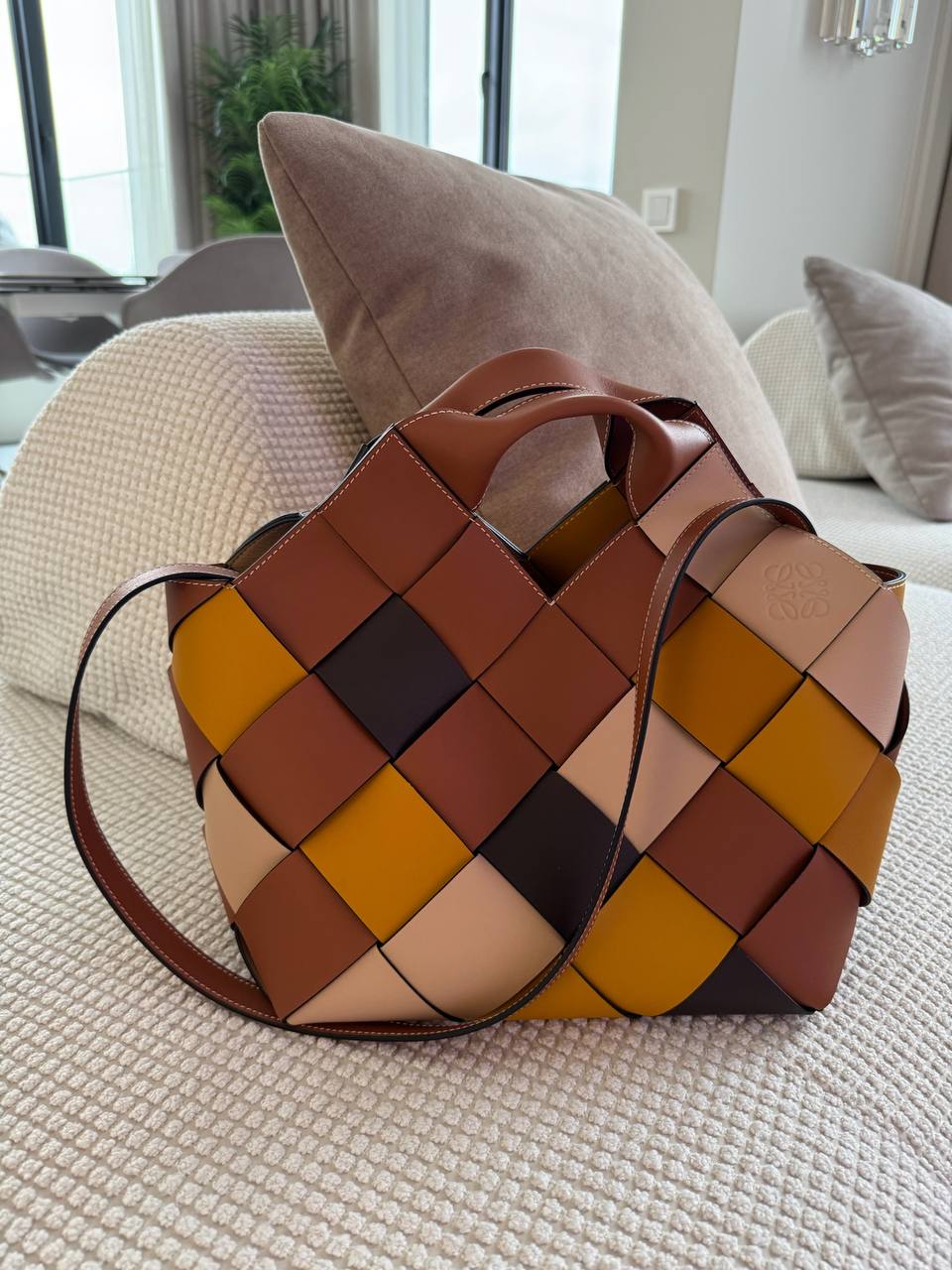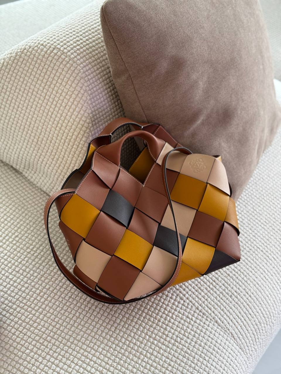 Сумка женская Loewe LUX-113317 выполнена в плетеном стиле из разноцветных кожаных квадратов. Оттенки от бежевого и желтого до коричневого и черного создают интересный визуальный эффект. Сумка оснащена ручками и длинным ремешком для ношения через плечо.