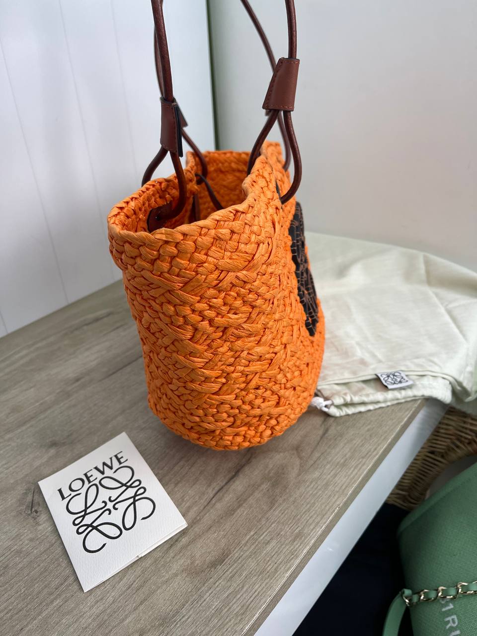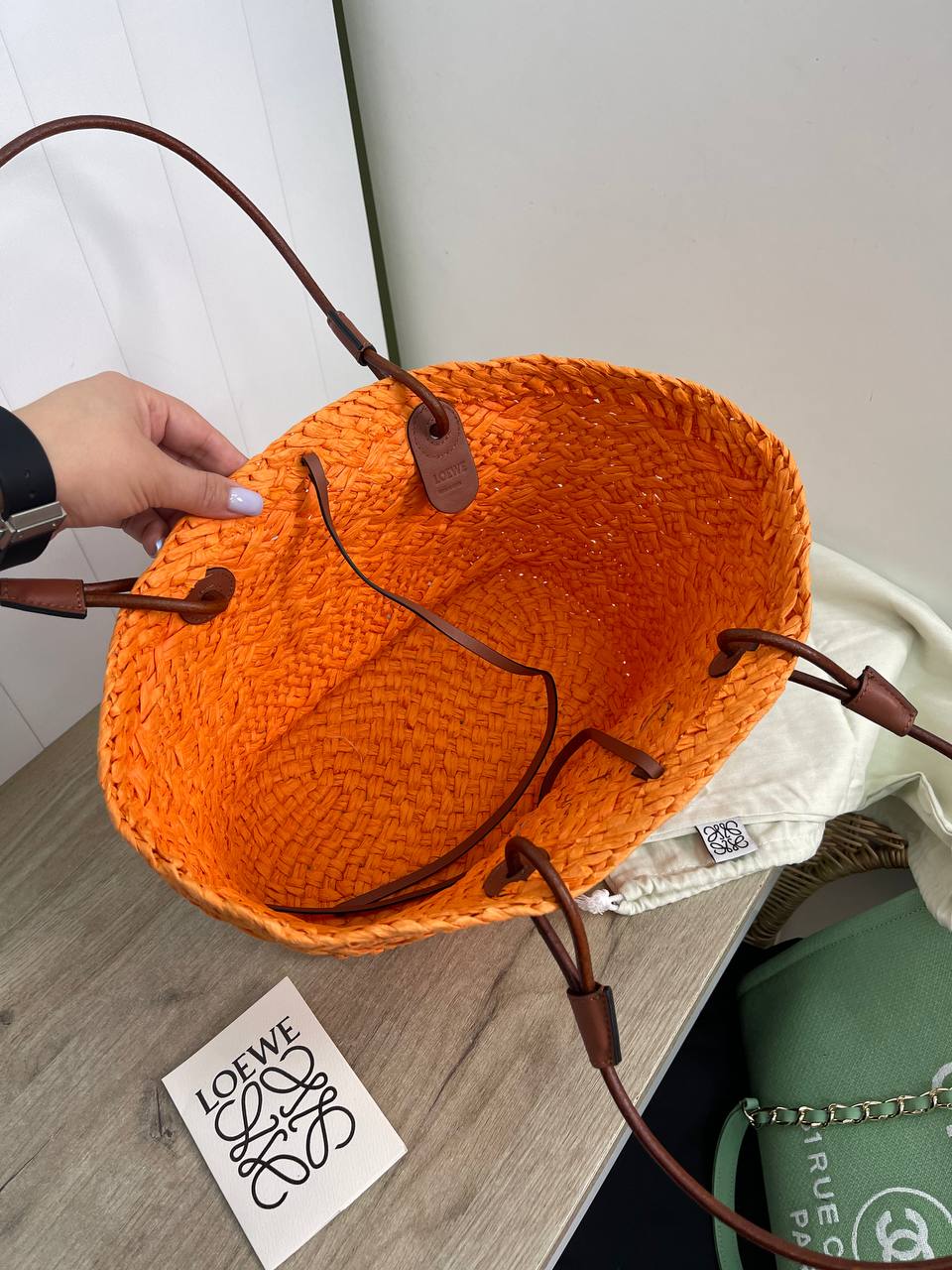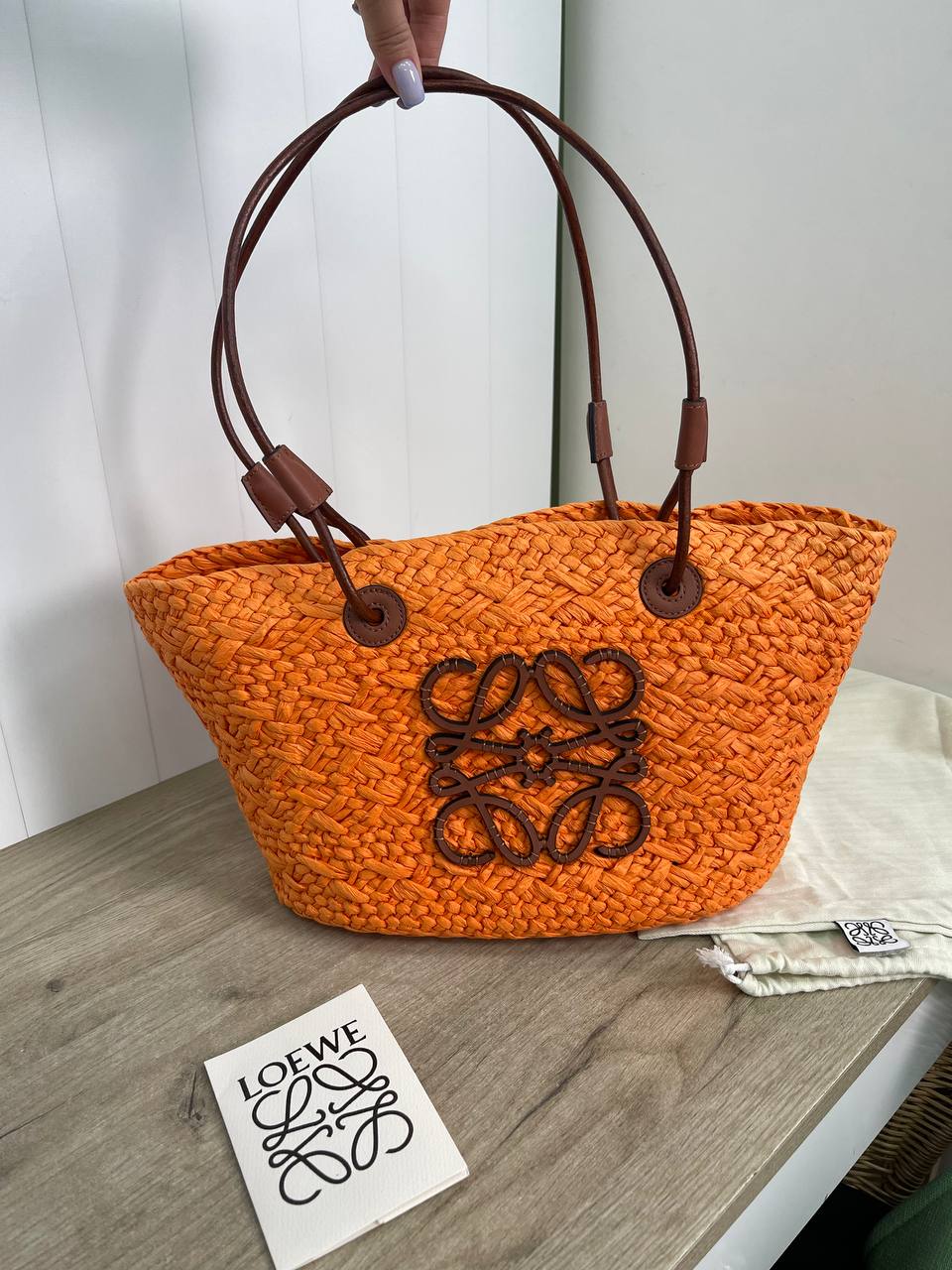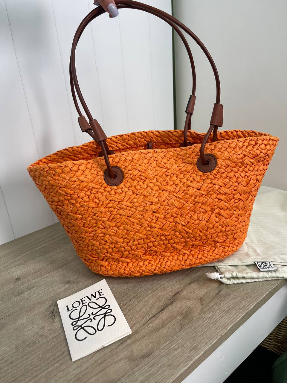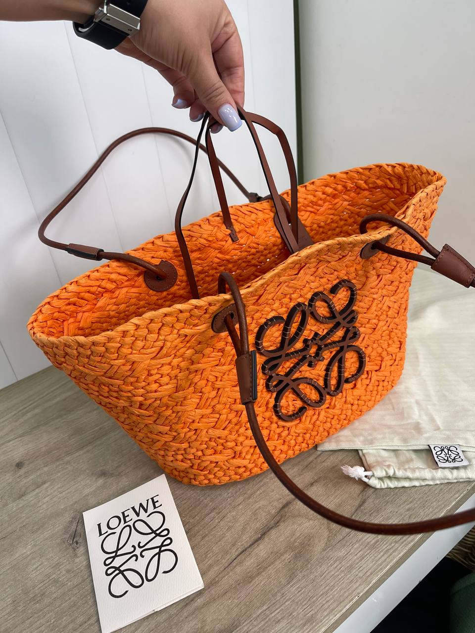 Сумка женская Loewe LUX-88381 выполнена в пляжном стиле, с оранжевым плетеным корпусом. У сумки две ручки коричневого цвета и темно-коричневый логотип бренда на передней части. Сумка подходит для летнего отдыха и повседневного использования.