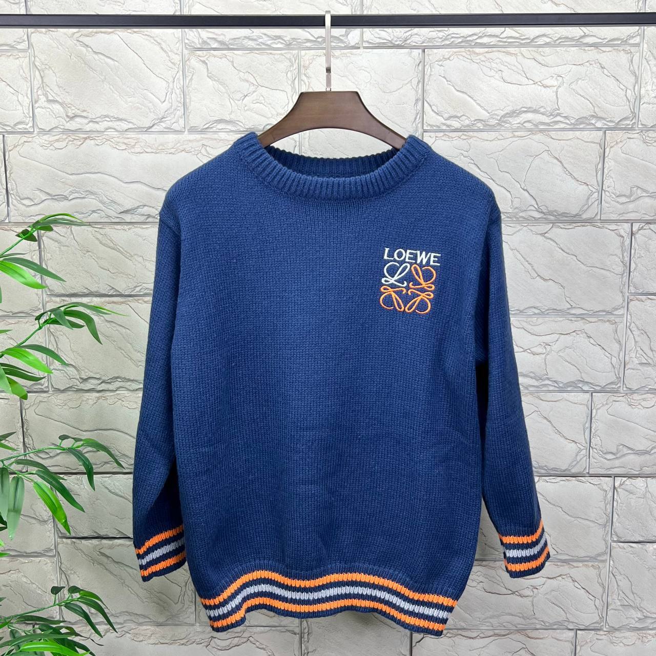 Свитер мужской Loewe LUX-82095 представляет собой стильный предмет гардероба. Он выполнен в темно-синем цвете с круглым вырезом и длинными рукавами. На груди расположен логотип бренда, а на манжетах и внизу свитера - полосатый дизайн с оранжевыми и белыми полосками.