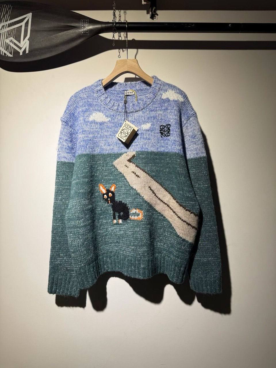 Стильный мужской свитер Loewe с оригинальным дизайном станет ярким акцентом в вашем гардеробе. Модель выполнена в синих и зеленых тонах с изображением пейзажа и кота. Этот свитер подчеркнет вашу индивидуальность и добавит образу неповторимости.