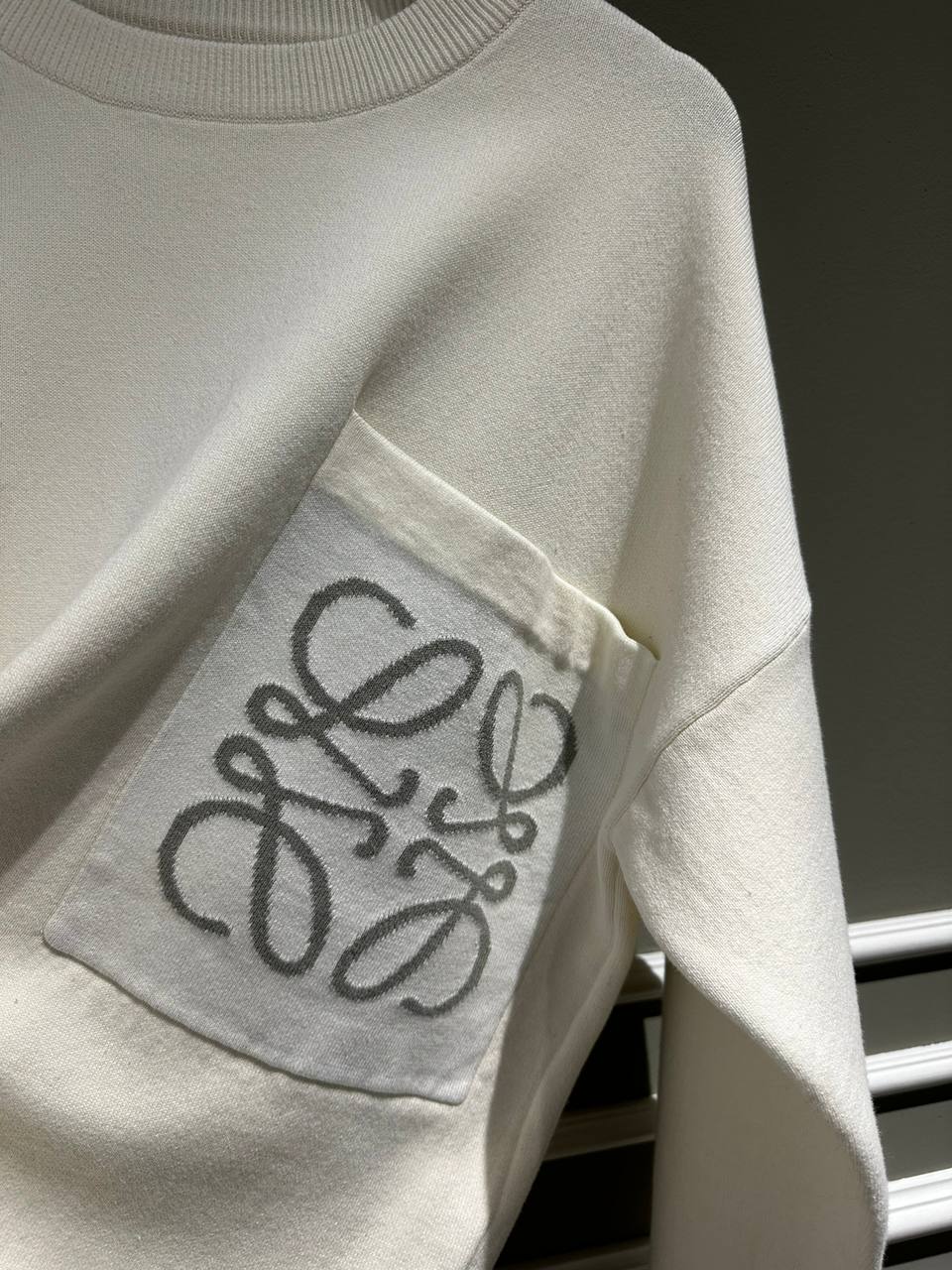 Свитшот Loewe LUX-82494 – это стильный предмет гардероба от известного бренда. Свитшот кремового цвета с крупным накладным карманом, украшенным логотипом бренда. Он идеально подходит для создания повседневных образов.