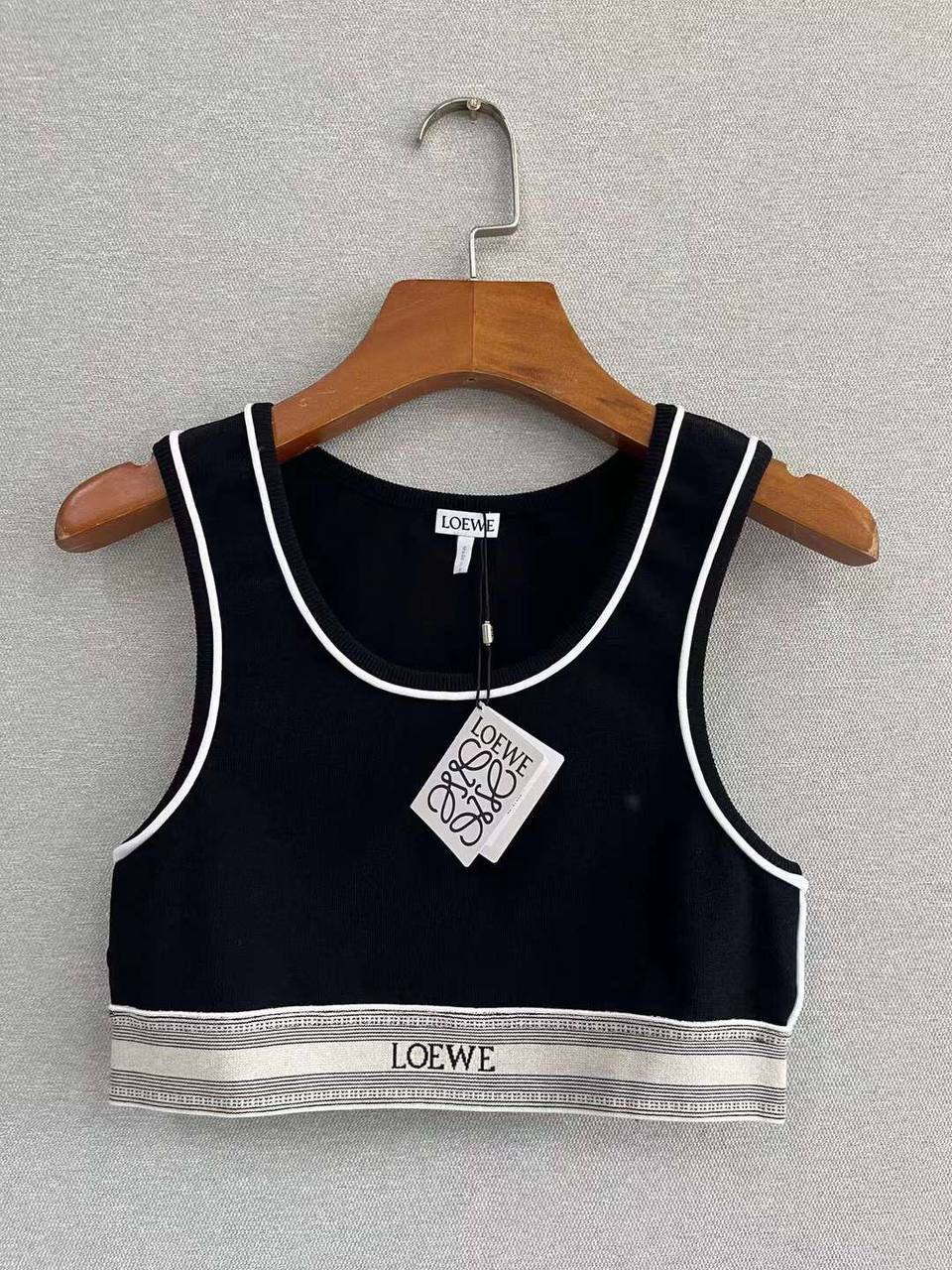 Топ Loewe LUX-93592 - это спортивный топ, который сочетает в себе элегантность и функциональность. Черный цвет топа дополнен контрастной отделкой, создавая стильный и современный вид. Идеально подходит для тренировок или для создания повседневных образов.