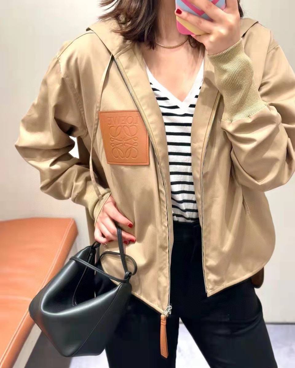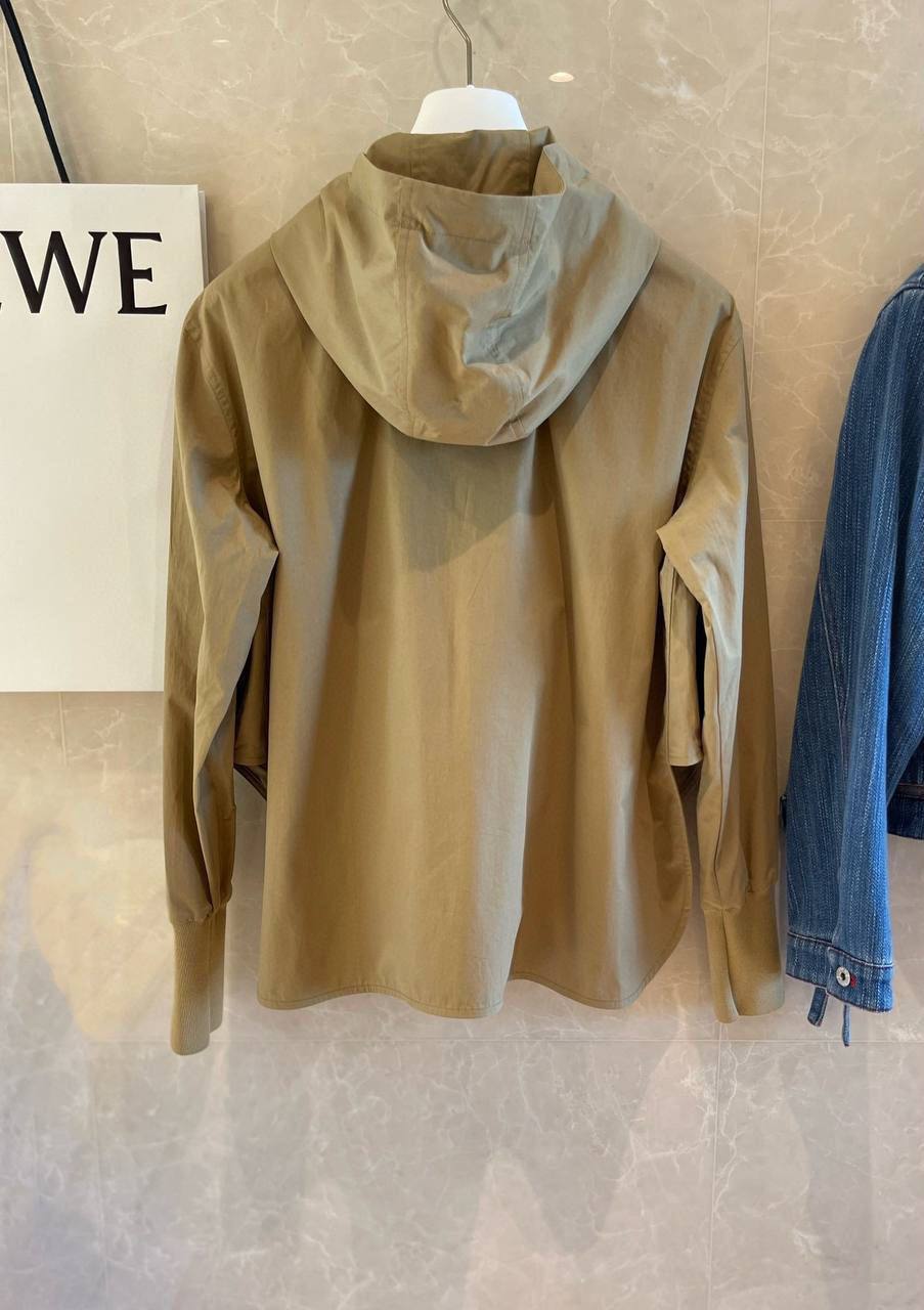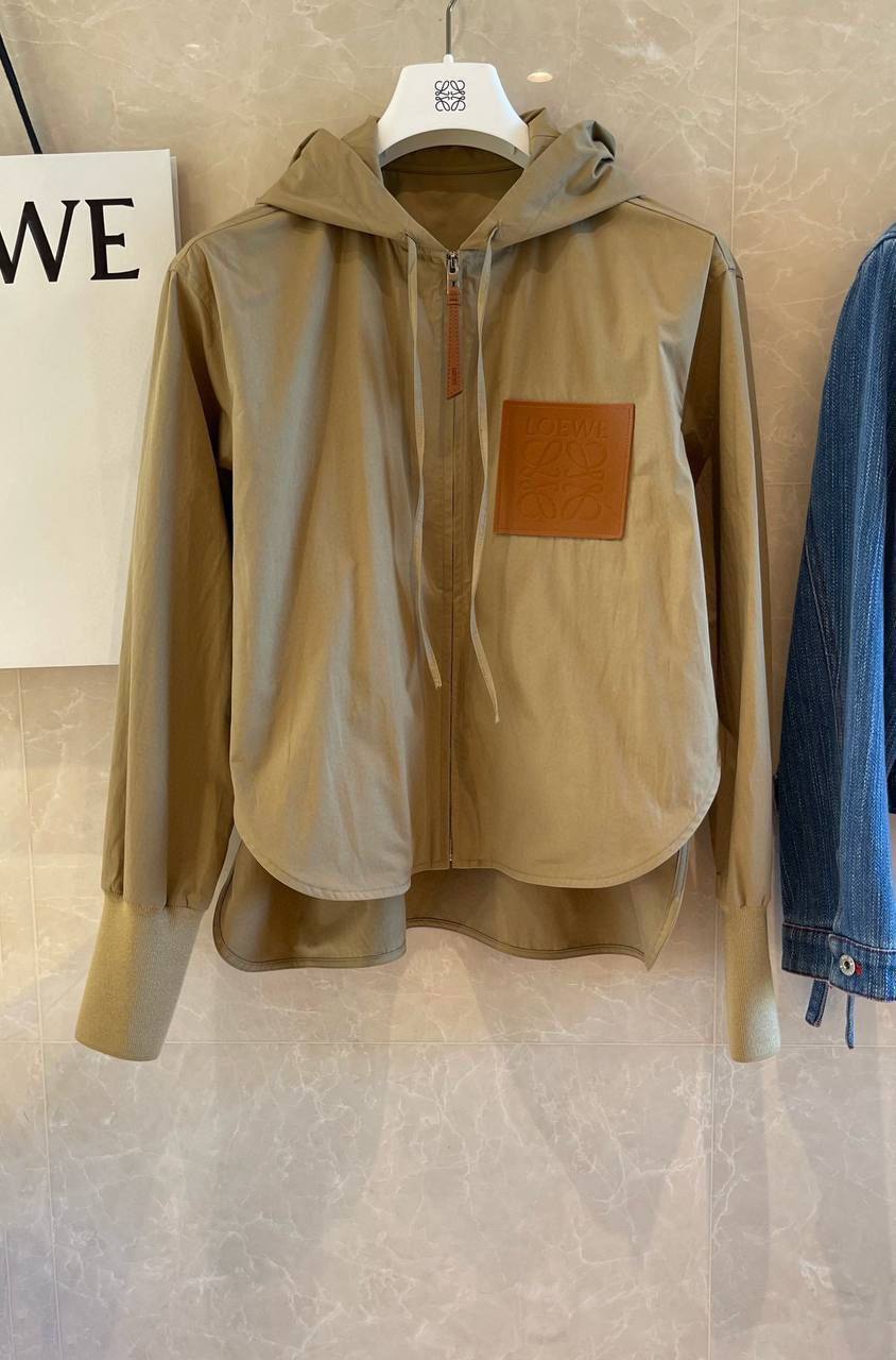 Ветровка Loewe LUX-93919 — это стильная и функциональная верхняя одежда для повседневного использования. Ветровка выполнена в нейтральном бежевом цвете, имеет спортивный крой с капюшоном и застежкой-молнией. На груди расположен кожаный патч с логотипом бренда.