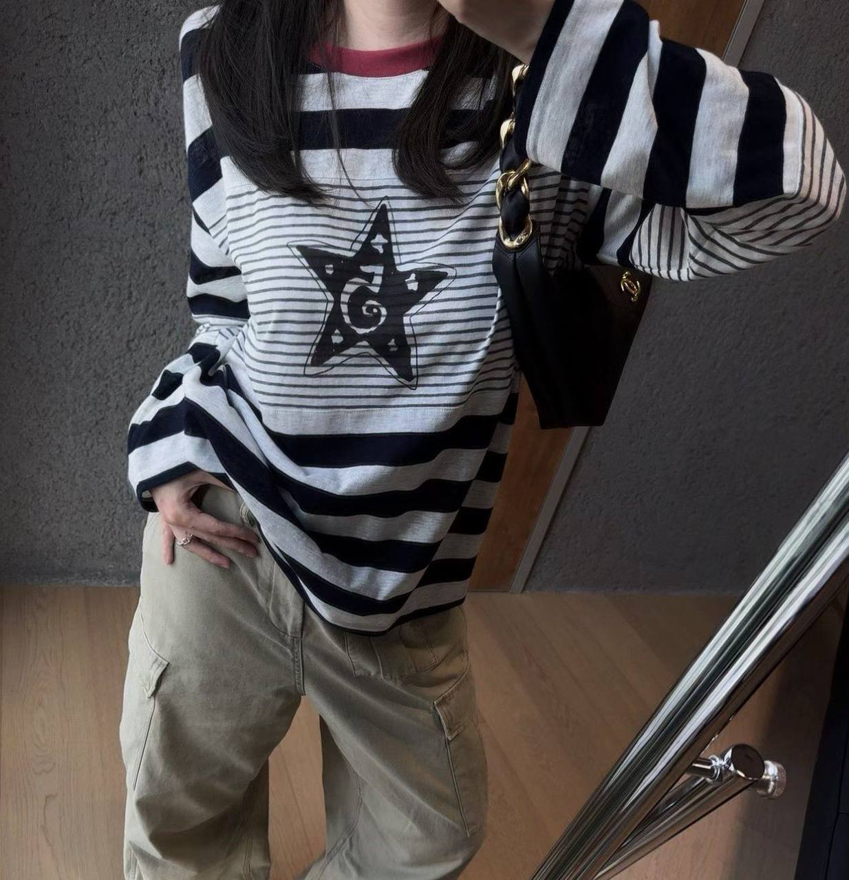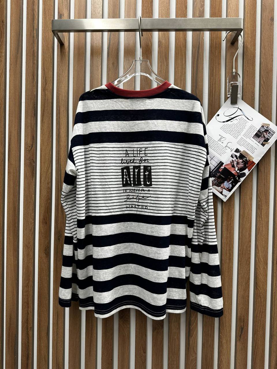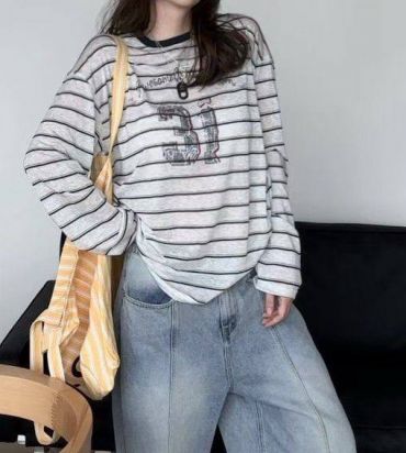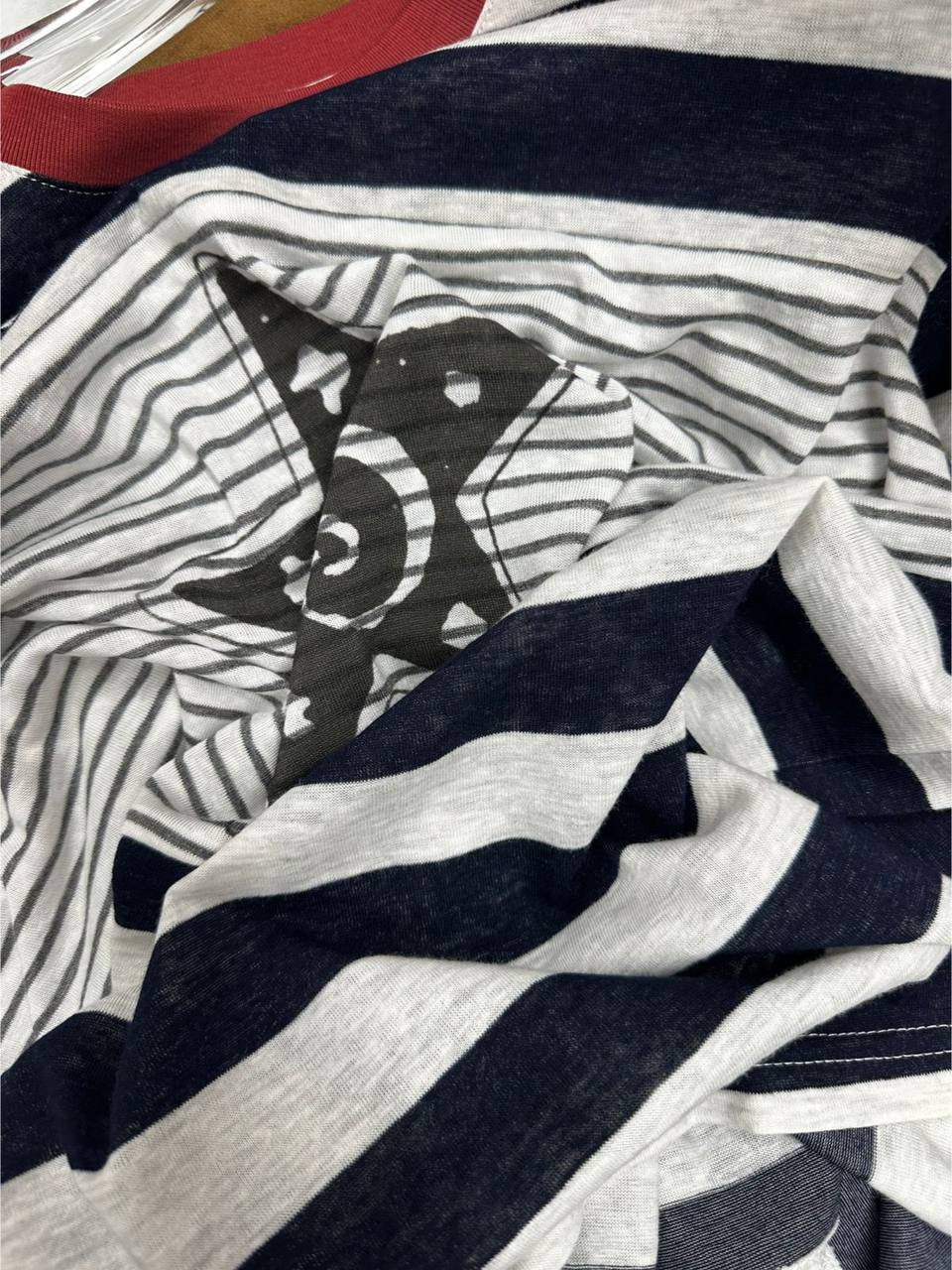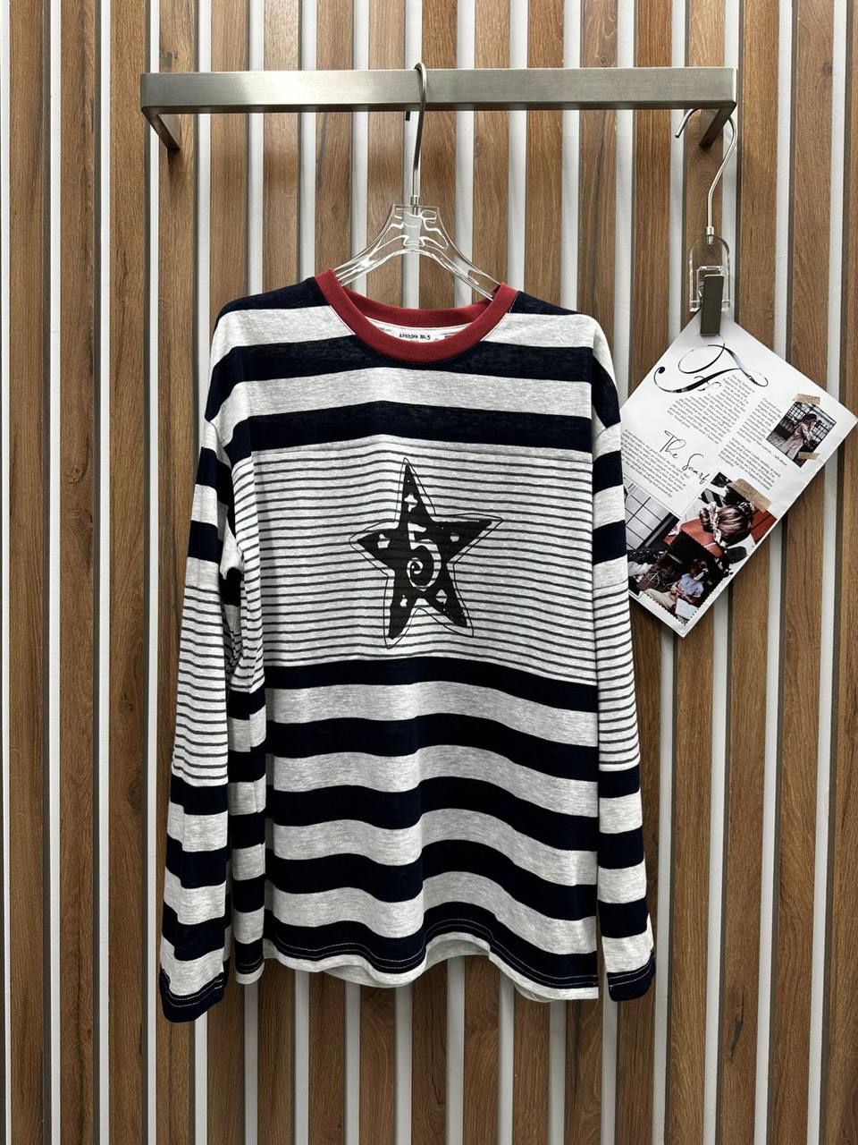 Лонгслив LUX-132179 – стильный предмет гардероба в полоску с оригинальным принтом в виде звезды, идеально подходящий для создания модных образов в повседневном стиле.
