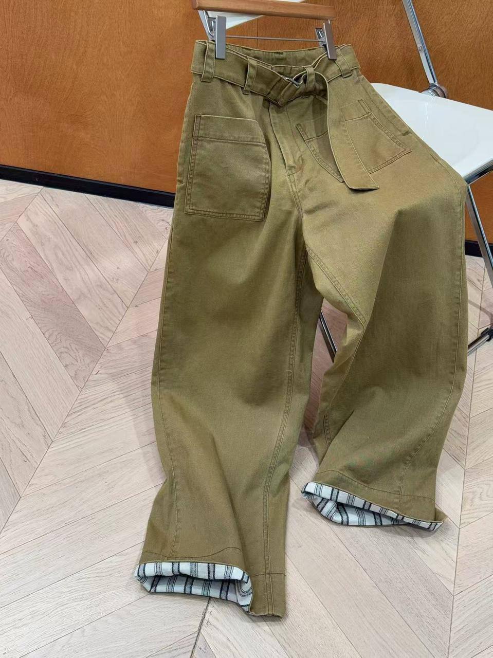 Джинсы Loro Piana LUX-119938 - это стильные и комфортные брюки, которые подойдут для создания повседневных образов. Джинсы выполнены в цвете хаки, с широким кроем, высокой посадкой и поясом с пряжкой. Штанины подворачиваются, открывая взгляду клетчатую подкладку.