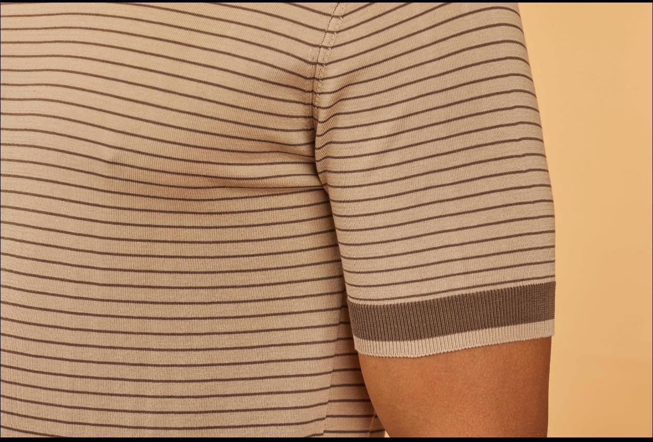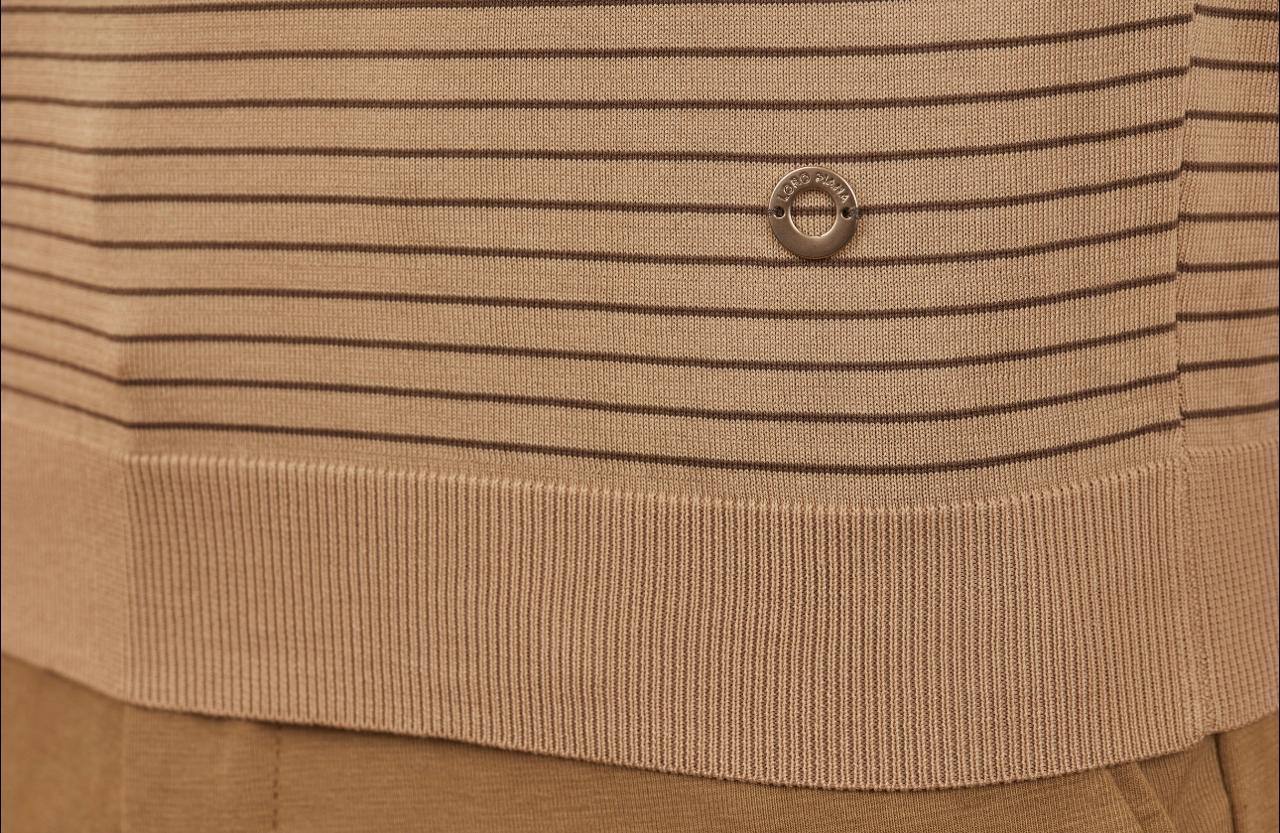 Мужская футболка Loro Piana LUX-113809 представляет собой стильную и комфортную вещь для повседневного гардероба. Футболка выполнена в бежевом цвете с темно-синими полосками. Текстура ткани создает интересные визуальные эффекты, а короткие рукава и круглый вырез горловины обеспечивают удобную посадку.