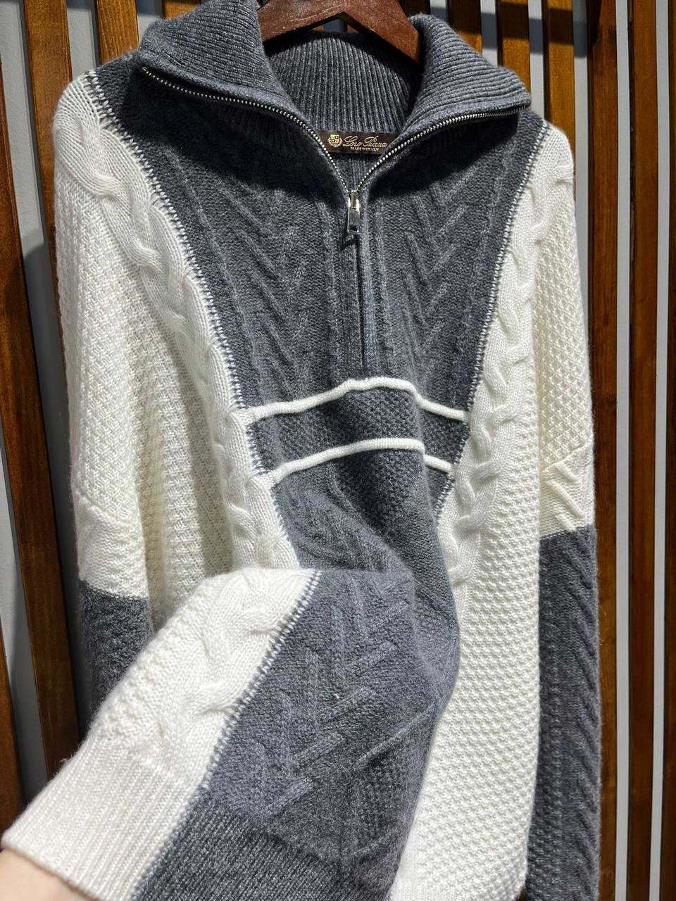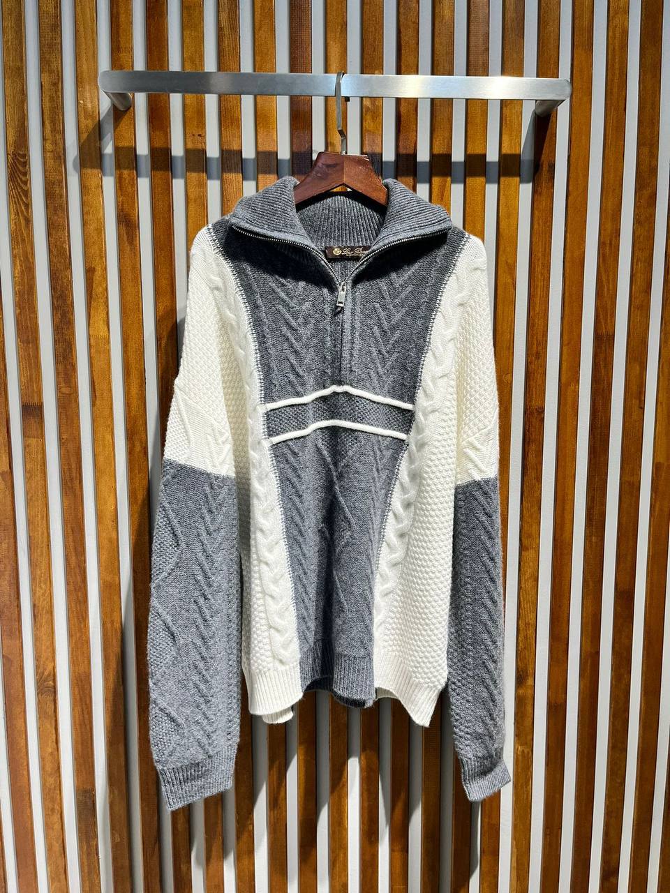 Кашемировый свитер Loro Piana LUX-94486 — это воплощение элегантности и комфорта. Свитер выполнен в комбинированных цветах: серый, белый и серый меланж, с добавлением молнии. Его текстура, созданная из кашемира, делает его идеальным выбором для создания стильных и уютных образов в прохладную погоду.