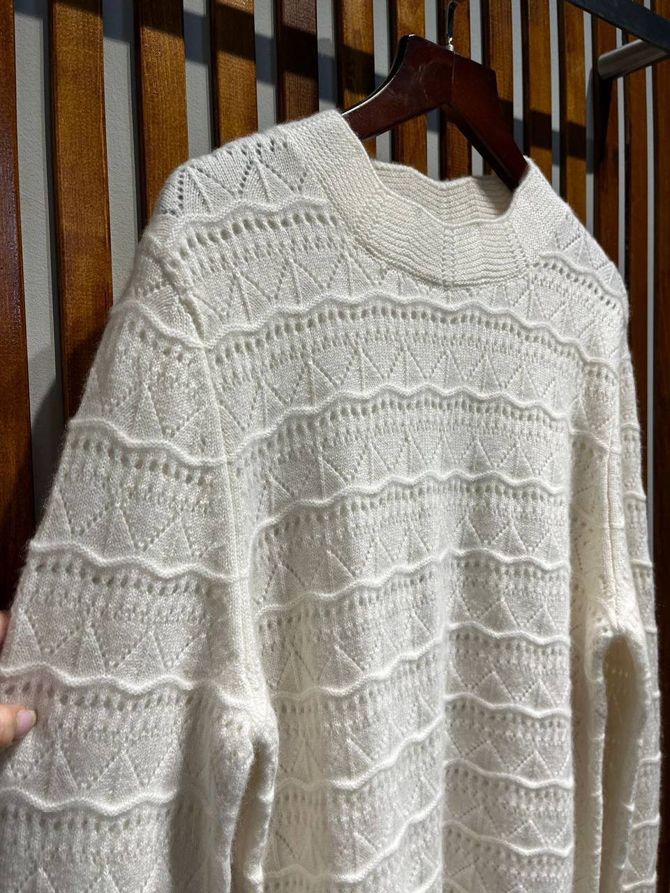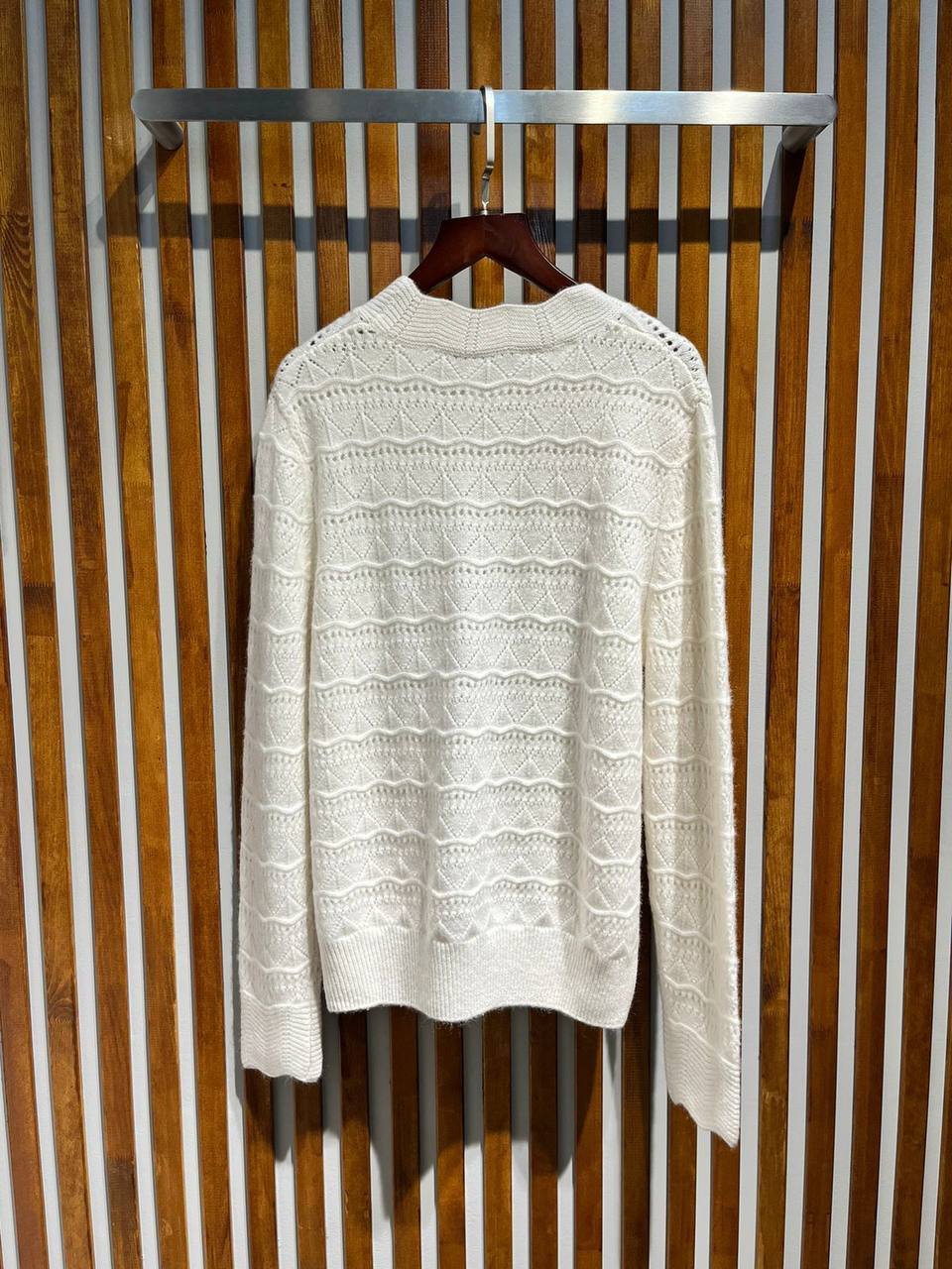 Кашемировый свитер Loro Piana LUX-94627 представлен в молочно-белом цвете, с нежным узором вязки. Этот свитер — воплощение элегантности и комфорта, который подойдет для повседневного использования, а также для создания стильных образов.