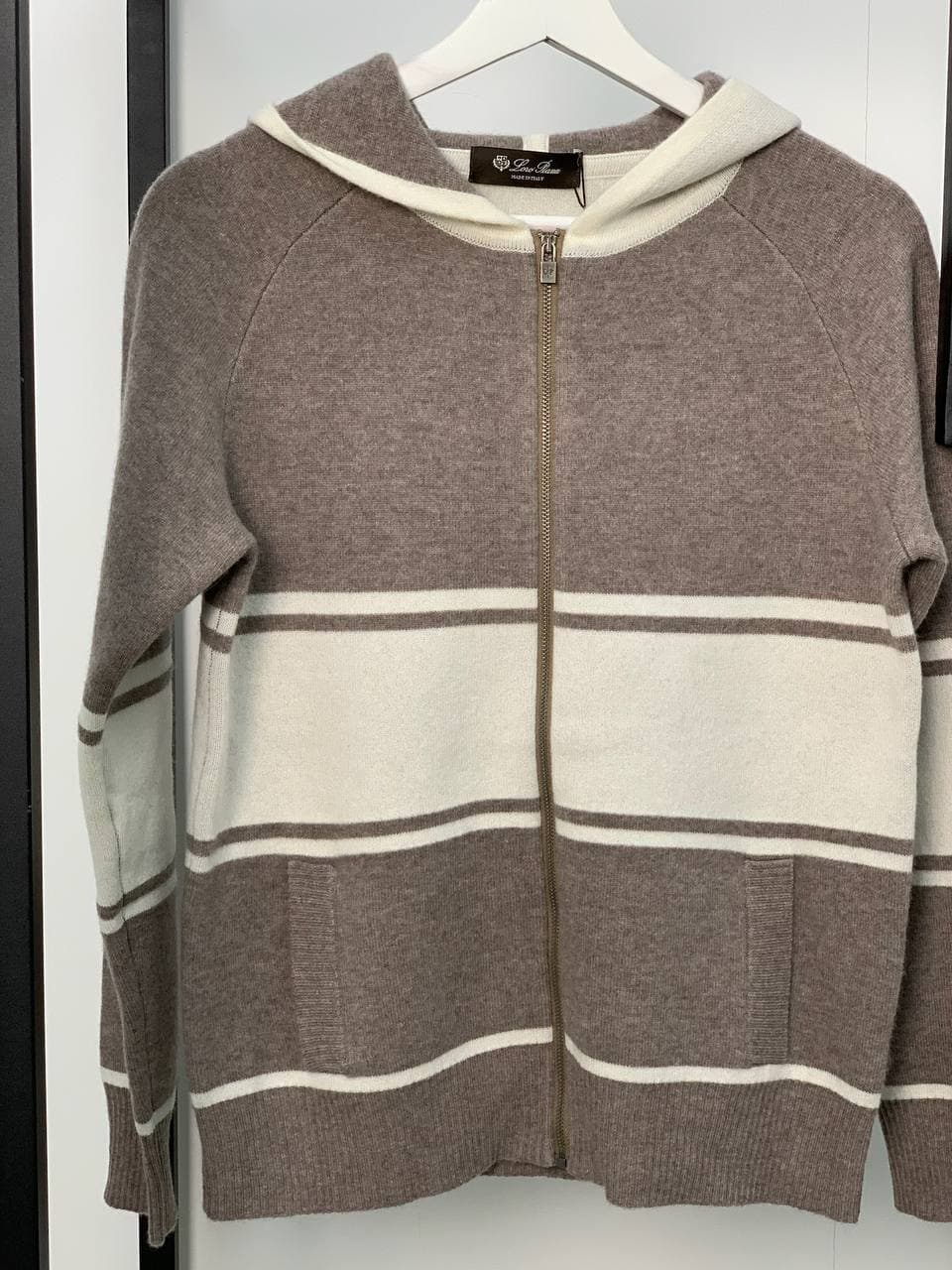 Эта кофта Loro Piana, артикул LUX-60266, выполнена в спортивно-повседневном стиле. Модель с капюшоном и застежкой-молнией украшена горизонтальными полосами, что придает ей узнаваемый вид. Благодаря нейтральной цветовой гамме, она легко впишется в любой гардероб.