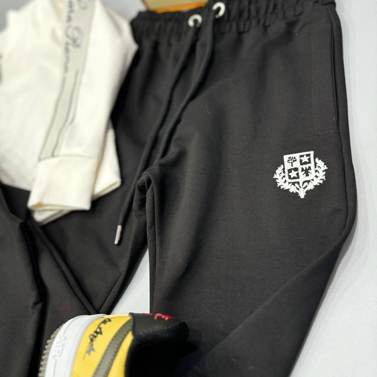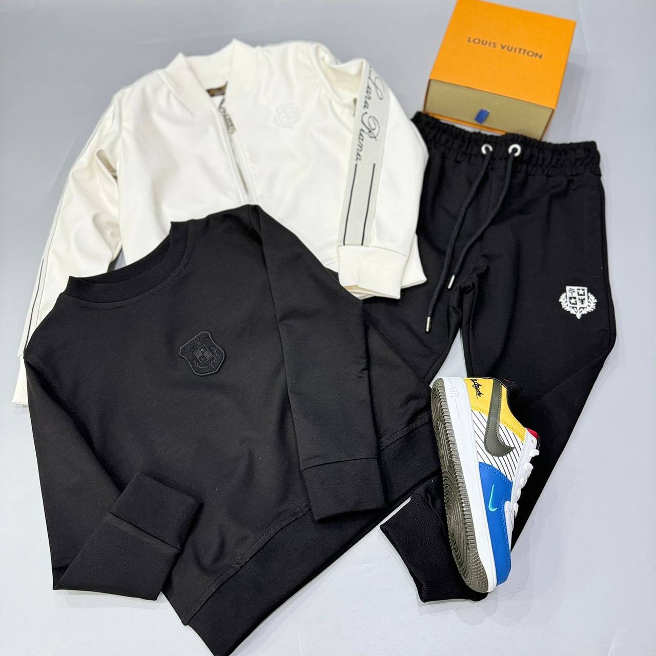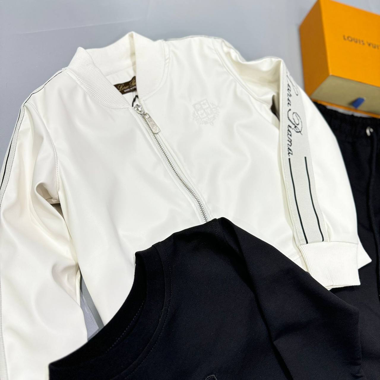 Костюм 3-ка Loro Piana LUX-114896 представлен в виде спортивного костюма, выполненного в черном цвете. Комплект состоит из свитшота, куртки-бомбера и спортивных штанов. Этот костюм подойдет для повседневного образа, обеспечивая комфорт и стильный вид.