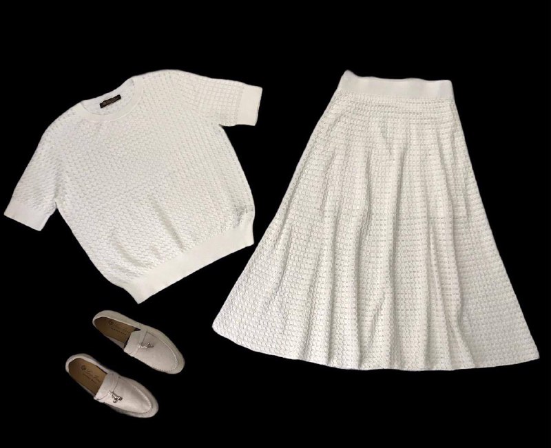 Элегантный комплект Loro Piana LUX-54470, состоящий из вязаной футболки с коротким рукавом и юбки А-силуэта, выполнен в нежном белом цвете. Этот изысканный ансамбль демонстрирует утонченный стиль бренда, идеально подходящий для создания утонченных образов.