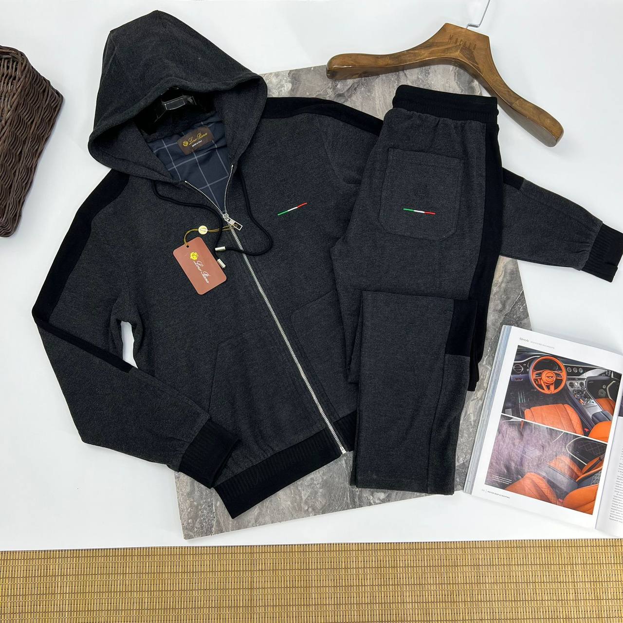 Спортивный костюм Loro Piana LUX-66285 представляет собой элегантный комплект, сочетающий в себе спортивный стиль и роскошь. Костюм выполнен в классическом темно-сером цвете с контрастными черными вставками по бокам и на рукавах. Комплект состоит из худи на молнии с капюшоном и брюк.