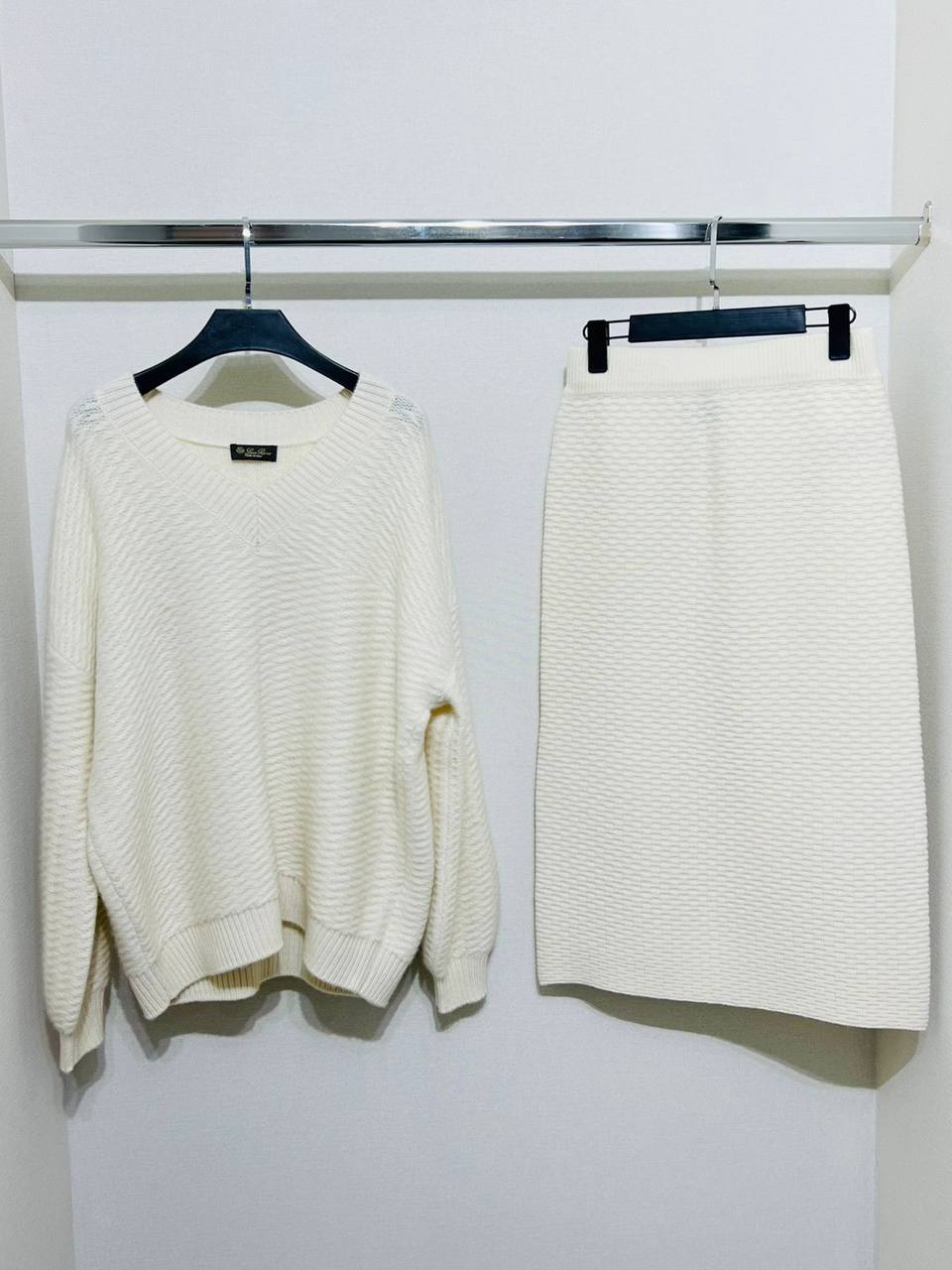 Костюм женский Loro Piana LUX-98454 представляет собой элегантный комплект, состоящий из свитера с V-образным вырезом и юбки-карандаш. Комплект выполнен в кремовом оттенке, создавая утонченный и изысканный образ. Идеально подходит для создания стильных повседневных и деловых образов.