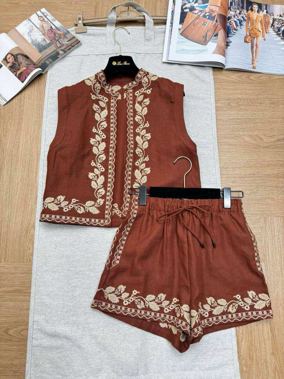 Костюм женский Loro Piana LUX-108169 представлен в виде комплекта из жилета и шорт в этническом стиле. Коричневый цвет ткани украшен вышивкой, которая добавляет изысканности. Этот костюм подойдет для создания стильных повседневных образов.