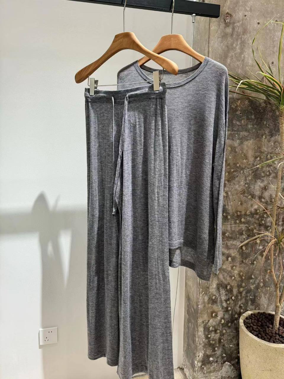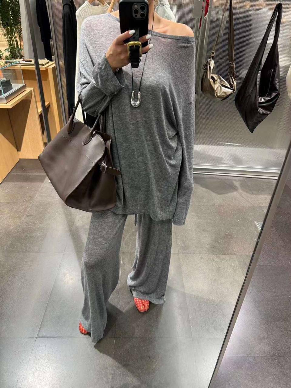 Костюм женский Loro Piana LUX-110822 – это воплощение комфорта и элегантности в повседневном стиле. Комплект состоит из свободной кофты с открытыми плечами и широких брюк, выполненных в расслабленном крое. Серый цвет костюма придает ему универсальность и позволяет легко сочетать его с различными элементами гардероба.