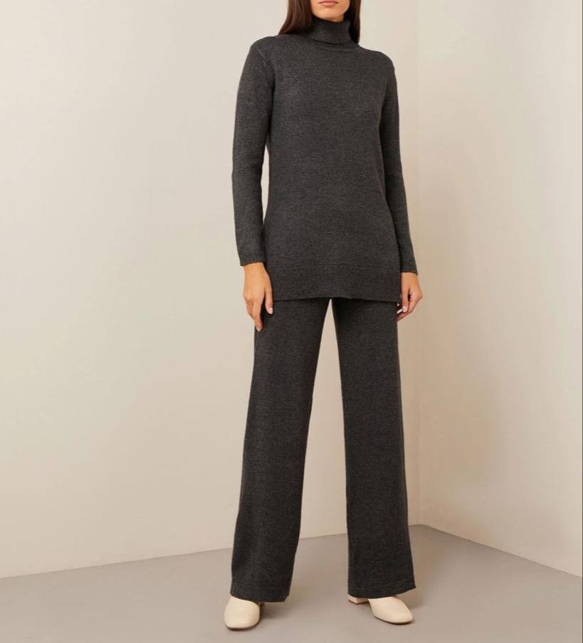 Костюм женский Loro Piana LUX-113330 представляет собой элегантный костюм, выполненный в современном стиле. Комплект состоит из джемпера с высоким воротником и широких брюк, выполненных в сером цвете. Текстура ткани мягкая и приятная на ощупь, что делает его идеальным выбором для повседневной носки.