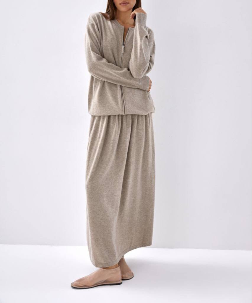 Костюм женский Loro Piana LUX-113606 представляет собой элегантный и комфортный комплект, выполненный в стиле casual. Состоит из кофты на молнии с длинными рукавами и длинной юбки. Костюм выполнен в универсальном бежевом цвете, что делает его подходящим для различных случаев.