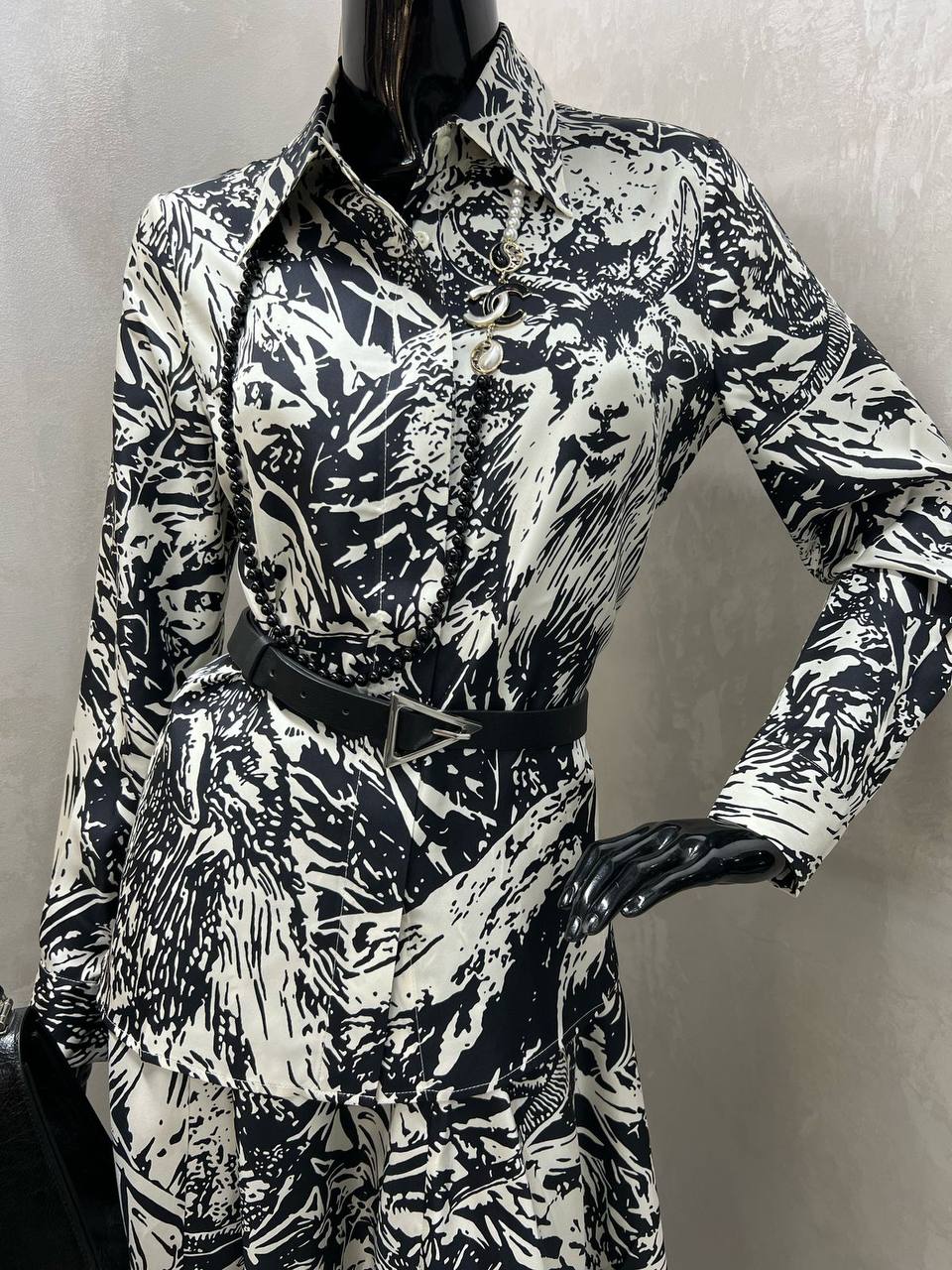 Костюм женский Loro Piana LUX-117414 представляет собой элегантный наряд рубашечного кроя. Костюм выполнен в черно-белой гамме с абстрактным принтом. Пояс подчеркивает талию, добавляя изящества силуэту.
