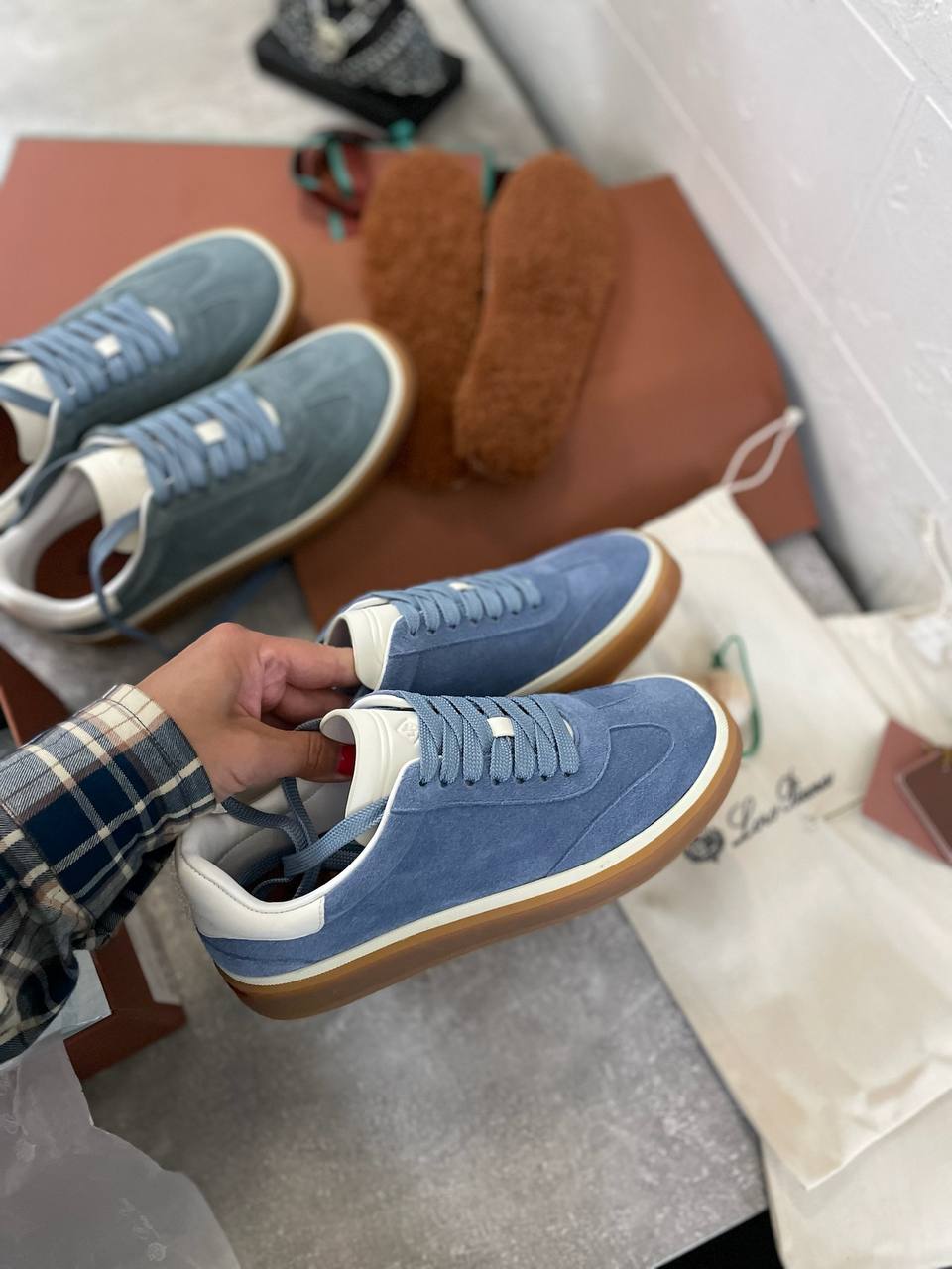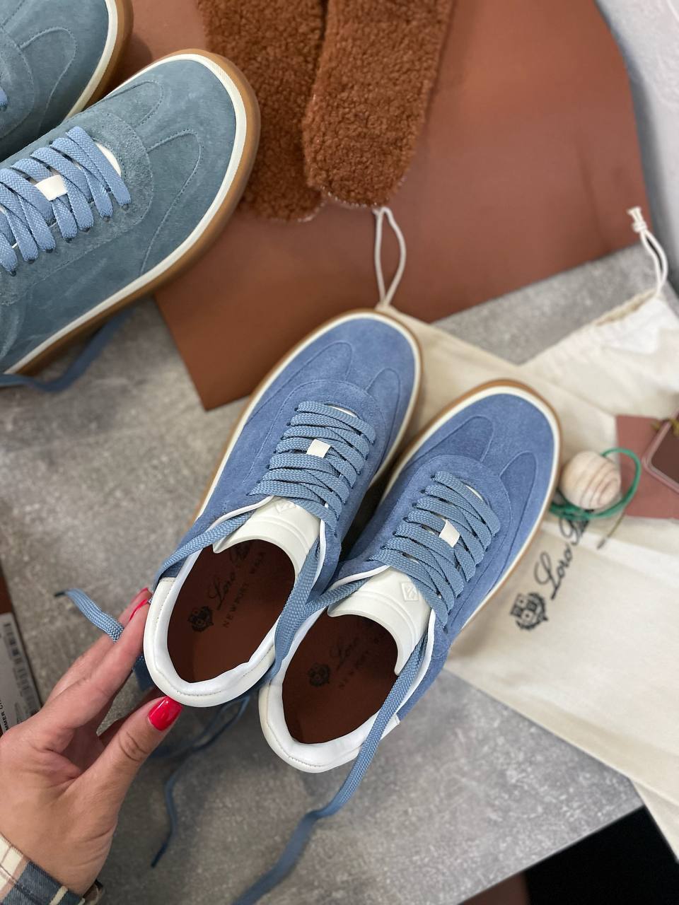 Кроссовки Loro Piana LUX-110571 — это воплощение стиля и комфорта. Голубые кроссовки из замши с белыми деталями и коричневой подошвой идеально подойдут для повседневной носки. Их минималистичный дизайн делает их универсальным дополнением к любому гардеробу.