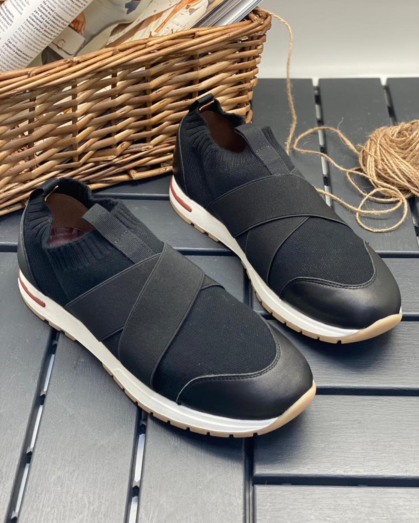 Эти черные кроссовки Loro Piana LUX-47486 представляют собой стильное и современное решение для повседневной носки. Модель выполнена в минималистичном дизайне с использованием комбинации эластичного текстиля и натуральной кожи, что обеспечивает превосходный комфорт и хорошую воздухопроницаемость. Перекрещивающиеся эластичные ремешки не только служат декоративным элементом, но и надежно фиксируют ногу.
