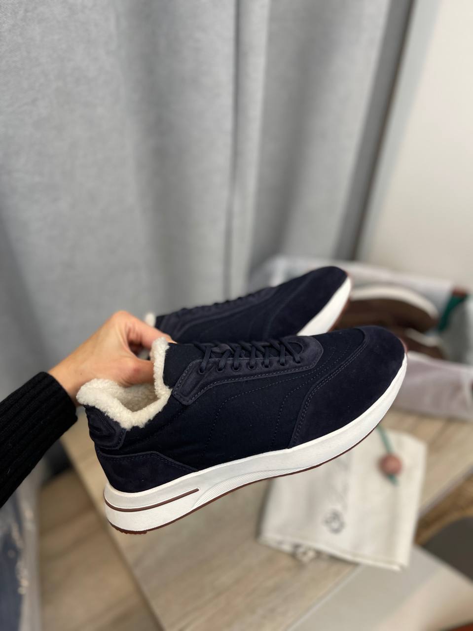 Кроссовки мужские Loro Piana LUX-97712 – это стильные мужские кроссовки, которые сочетают в себе комфорт и элегантный дизайн. Основной цвет кроссовок - темно-синий, с белой подошвой и элементами из белого меха. Эти кроссовки идеально подойдут для повседневной носки, обеспечивая удобство и подчеркивая индивидуальность.