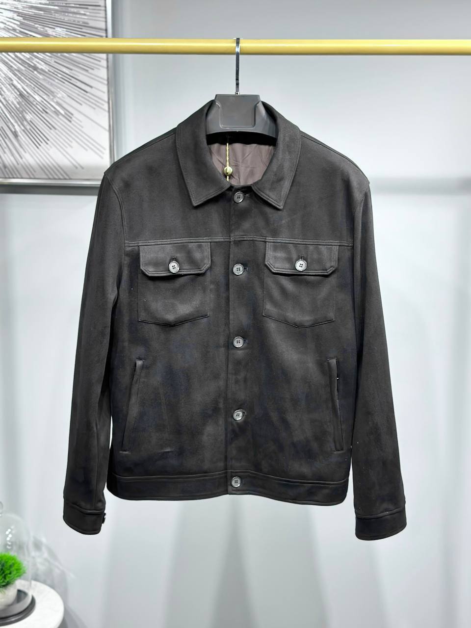 Мужская куртка Loro Piana LUX-85651 выполнена в классическом стиле. Она имеет прямой крой, темно-серый цвет и текстуру, напоминающую замшу. Эта куртка идеально подойдет для повседневной носки, создавая элегантный и современный образ.