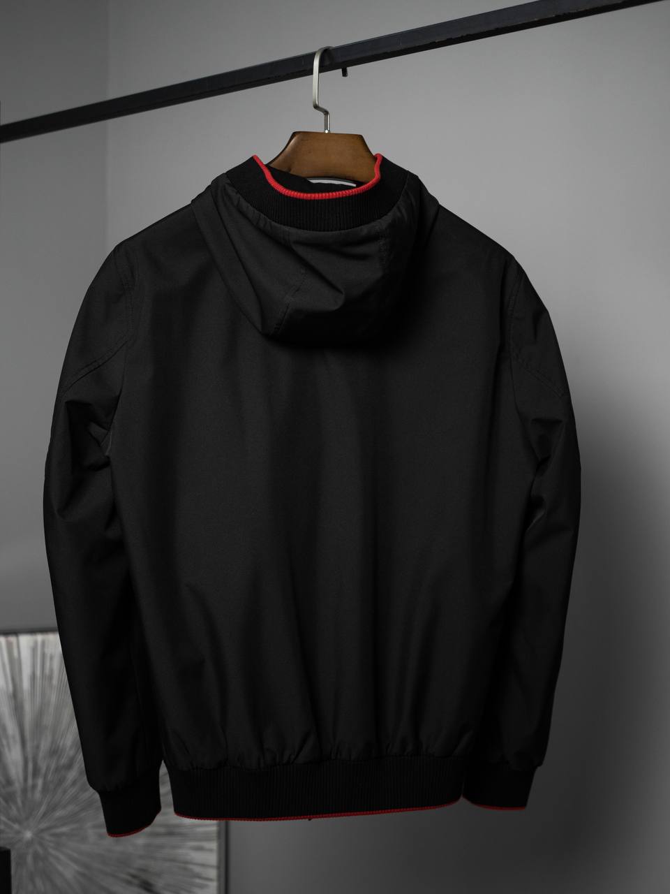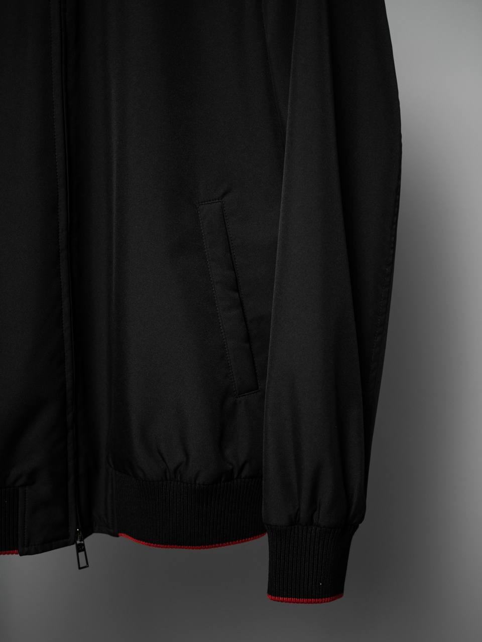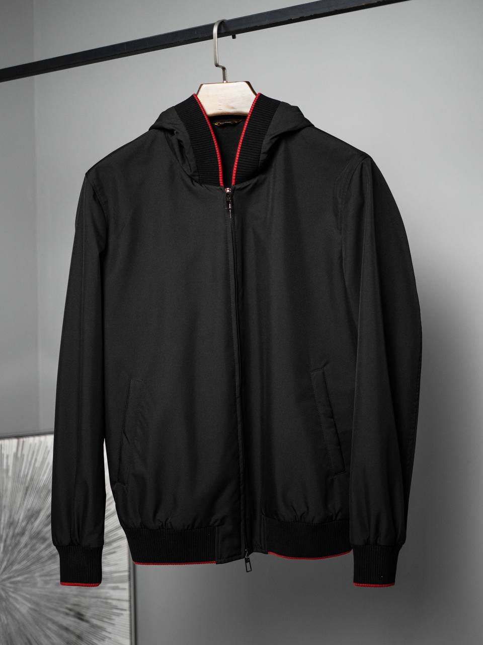 Мужская куртка Loro Piana LUX-104261 — это стильная и функциональная куртка для повседневной носки. Куртка выполнена в классическом черном цвете с контрастными красными деталями на воротнике, манжетах и подоле, что придает ей элегантный вид. Имеет спортивный стиль.