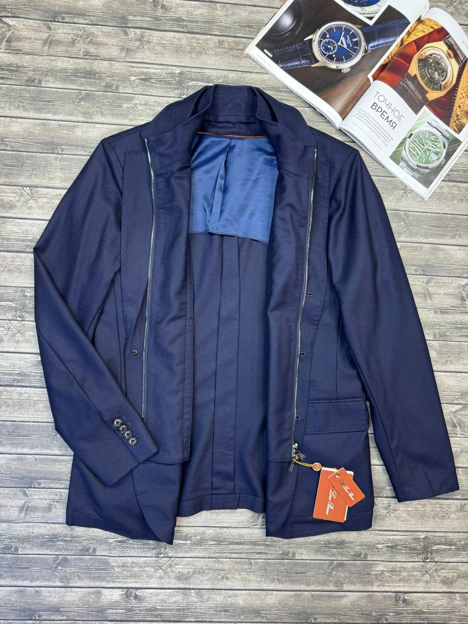 Куртка-пиджак Loro Piana LUX-109429, выполнена в классическом стиле, имеет темно-синий цвет. Текстура ткани выглядит гладкой, а сам предмет одежды, вероятно, предназначен для создания элегантных образов, подходящих для различных событий.