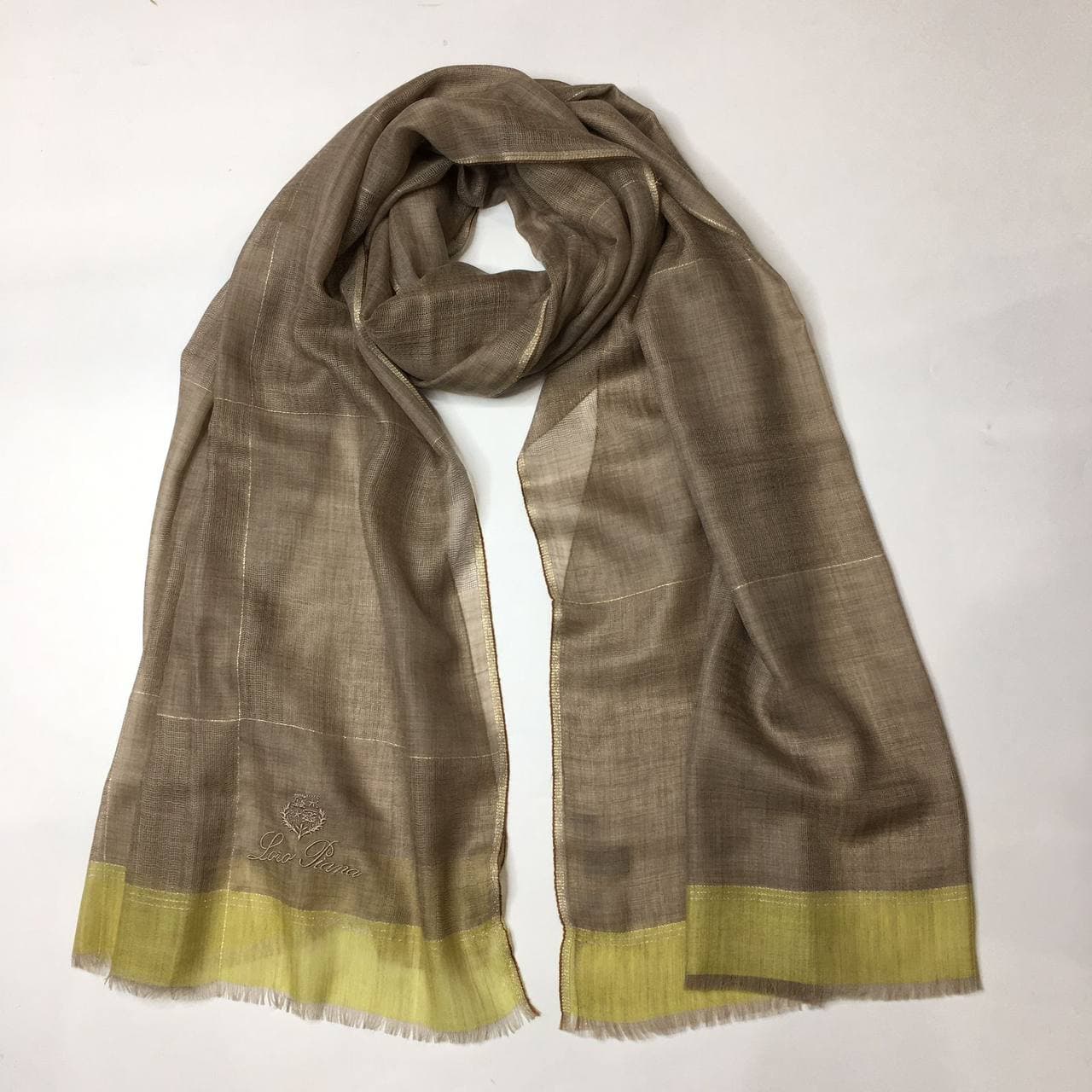 Этот элегантный палантин Loro Piana LUX-57523 выполнен в классическом стиле, который легко впишется в любой гардероб. Изделие украшено деликатной вышивкой бренда и имеет стильную клетчатую текстуру, дополненную золотистыми нитями. Контрастная салатовая полоса с бахромой по краям добавляет оригинальности.