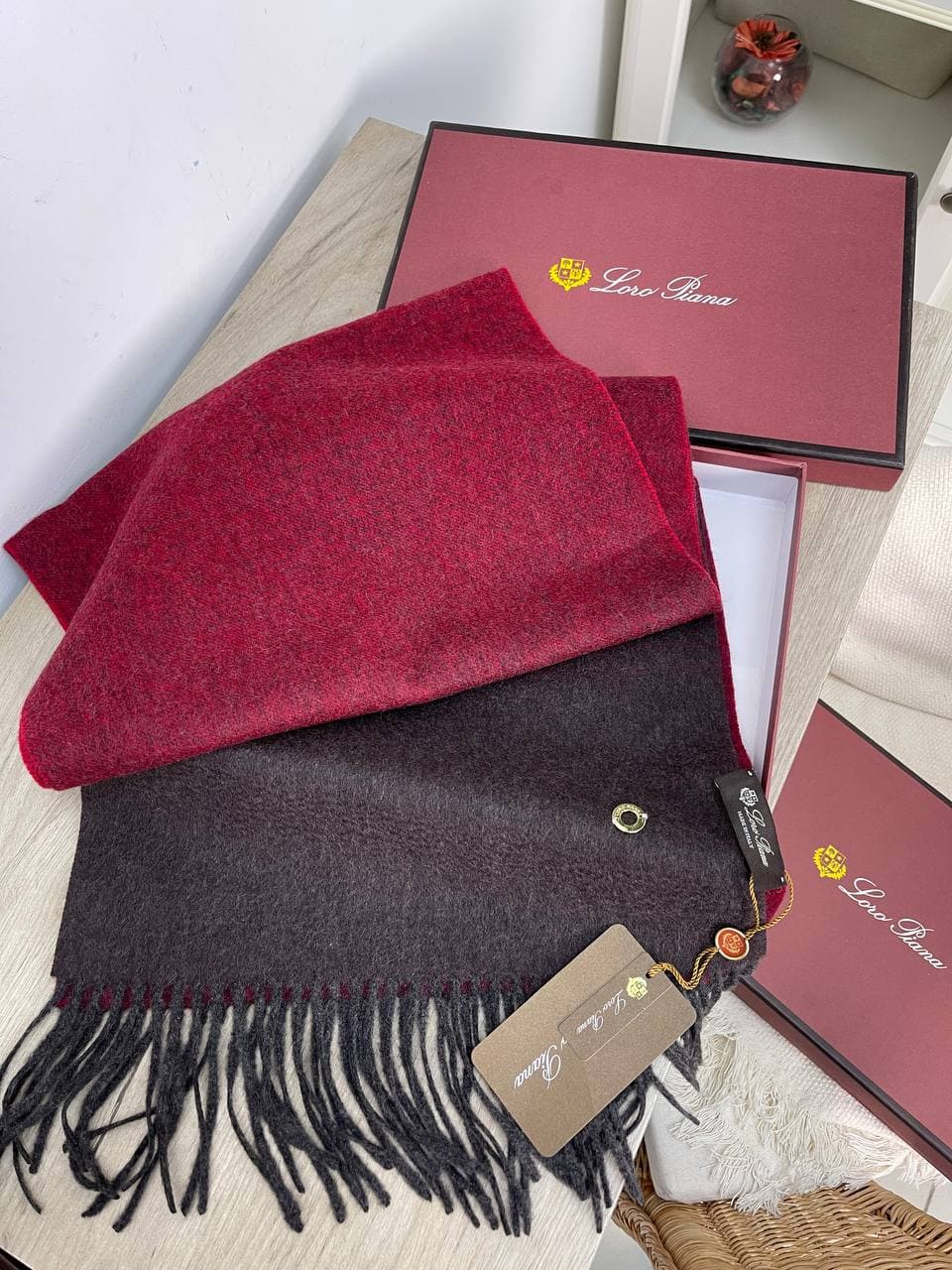 Шарф Loro Piana LUX-62040 представляет собой элегантный аксессуар, выполненный в современном стиле. Двусторонний дизайн, сочетающий бордовый и темно-серый цвета, придает ему универсальность и позволяет комбинировать с различными нарядами. Этот шарф идеально дополнит как деловой, так и повседневный образ, подчеркивая ваш утонченный вкус.