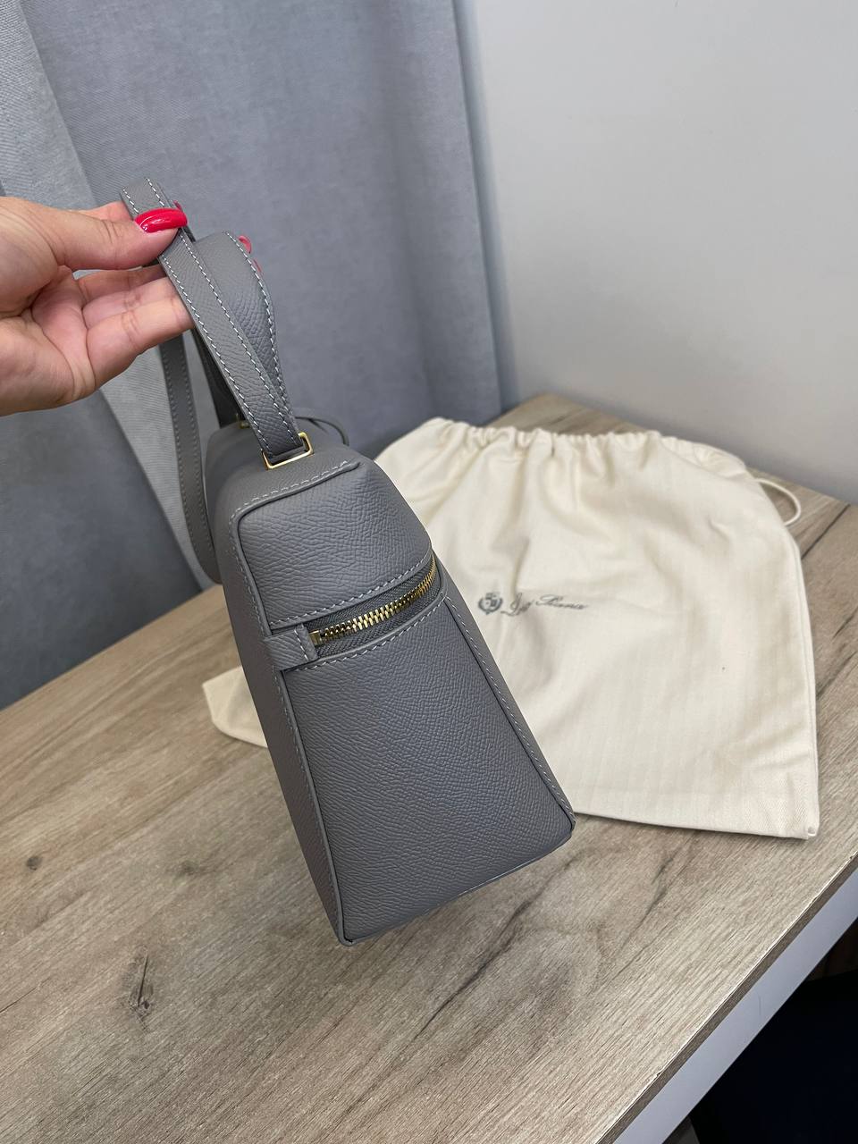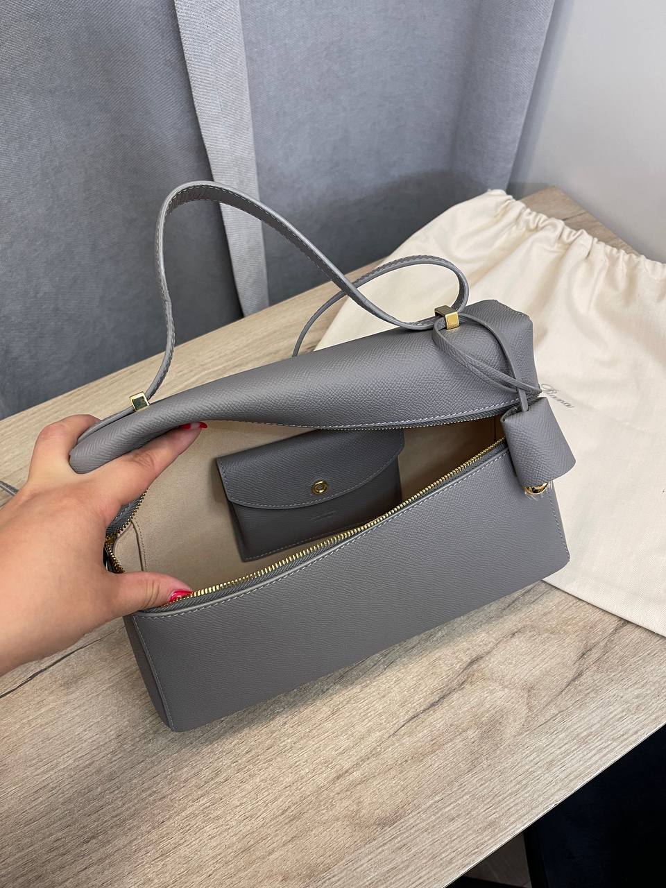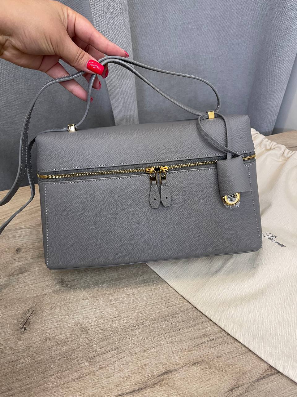 Сумка женская 27 см Loro Piana LUX-109125 — это стильный аксессуар для повседневного использования, выполненный в классическом стиле. Сумка выполнена в сером цвете, имеет прямоугольную форму и оснащена удобной ручкой для ношения на плече. Текстура изделия выглядит гладкой, что подчеркивает элегантность модели.