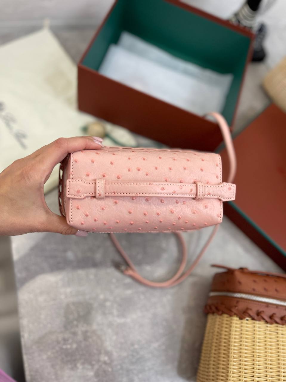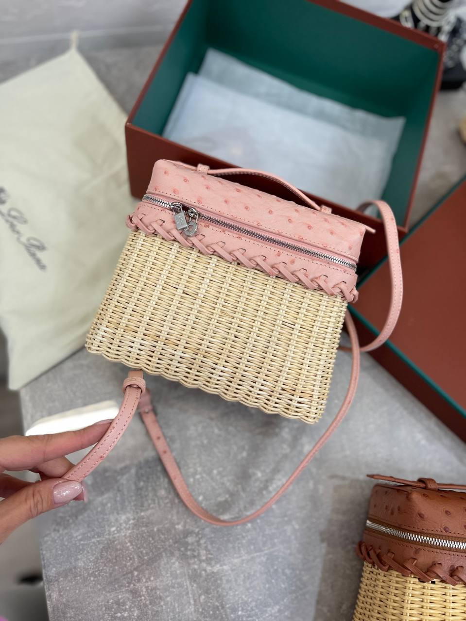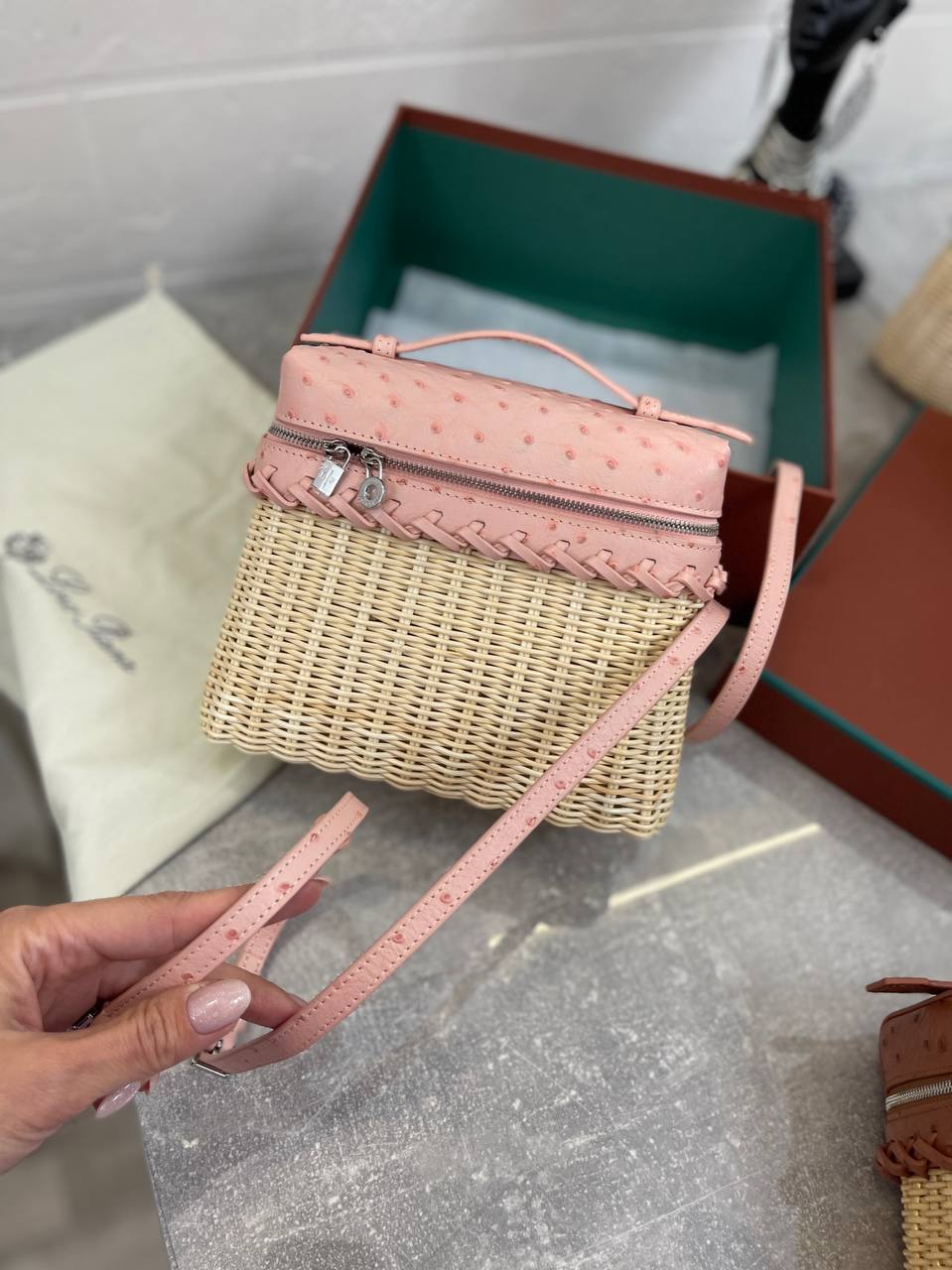 Сумка женская Loro Piana LUX-95211 — это элегантный аксессуар для современных женщин. Сумка выполнена в нежно-розовом цвете, имеет текстуру кожи. Дизайн сочетает в себе плетеный материал основы и кожаную отделку верха, что придает сумке уникальный и стильный вид.