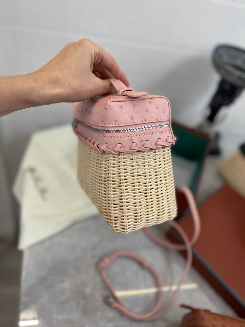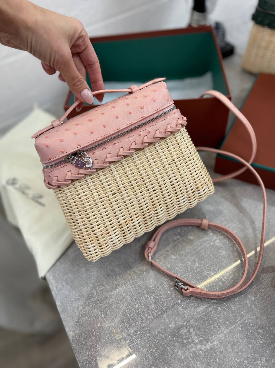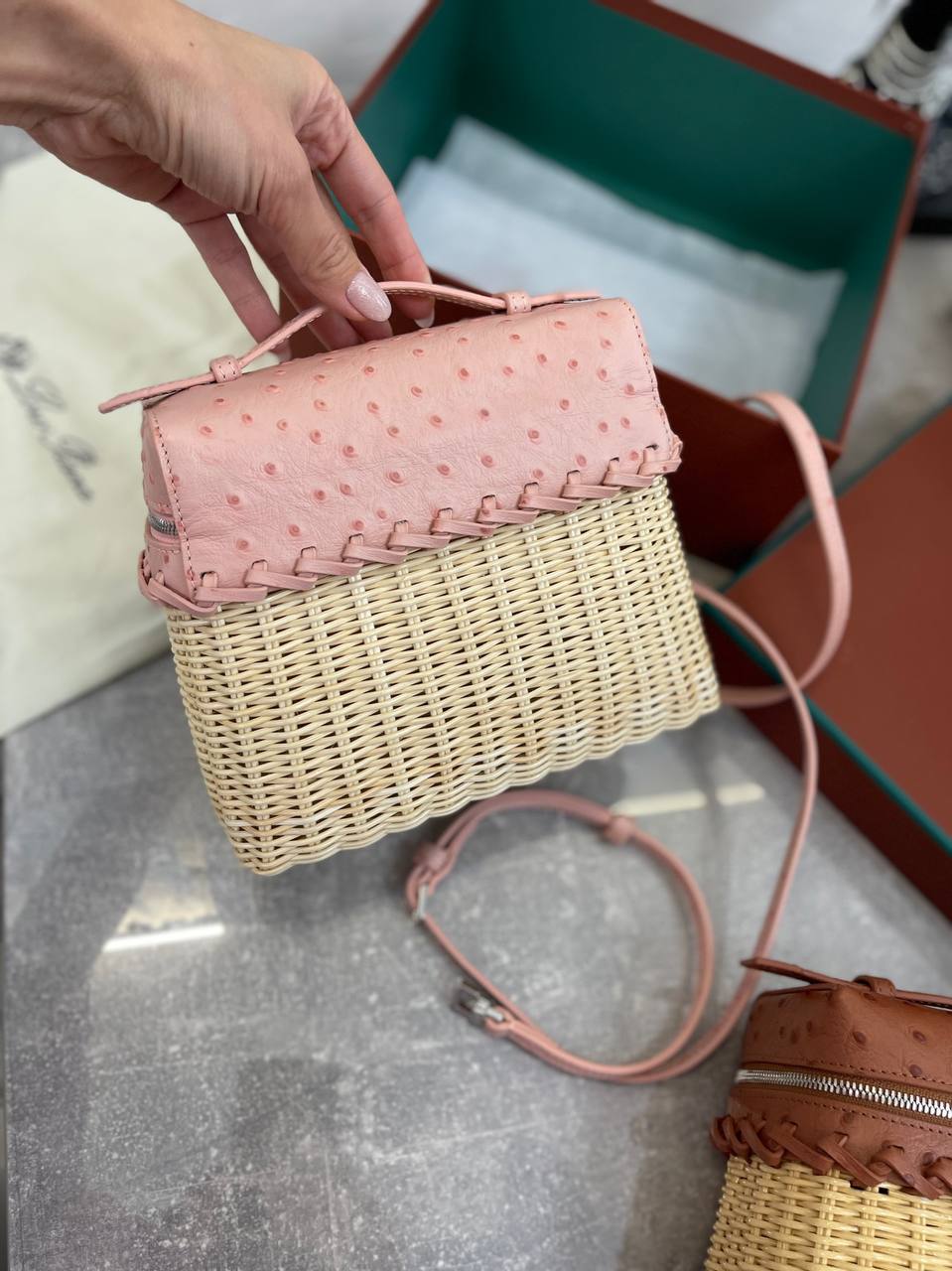 Сумка женская Loro Piana LUX-95211 — это элегантный аксессуар для современных женщин. Сумка выполнена в нежно-розовом цвете, имеет текстуру кожи. Дизайн сочетает в себе плетеный материал основы и кожаную отделку верха, что придает сумке уникальный и стильный вид.