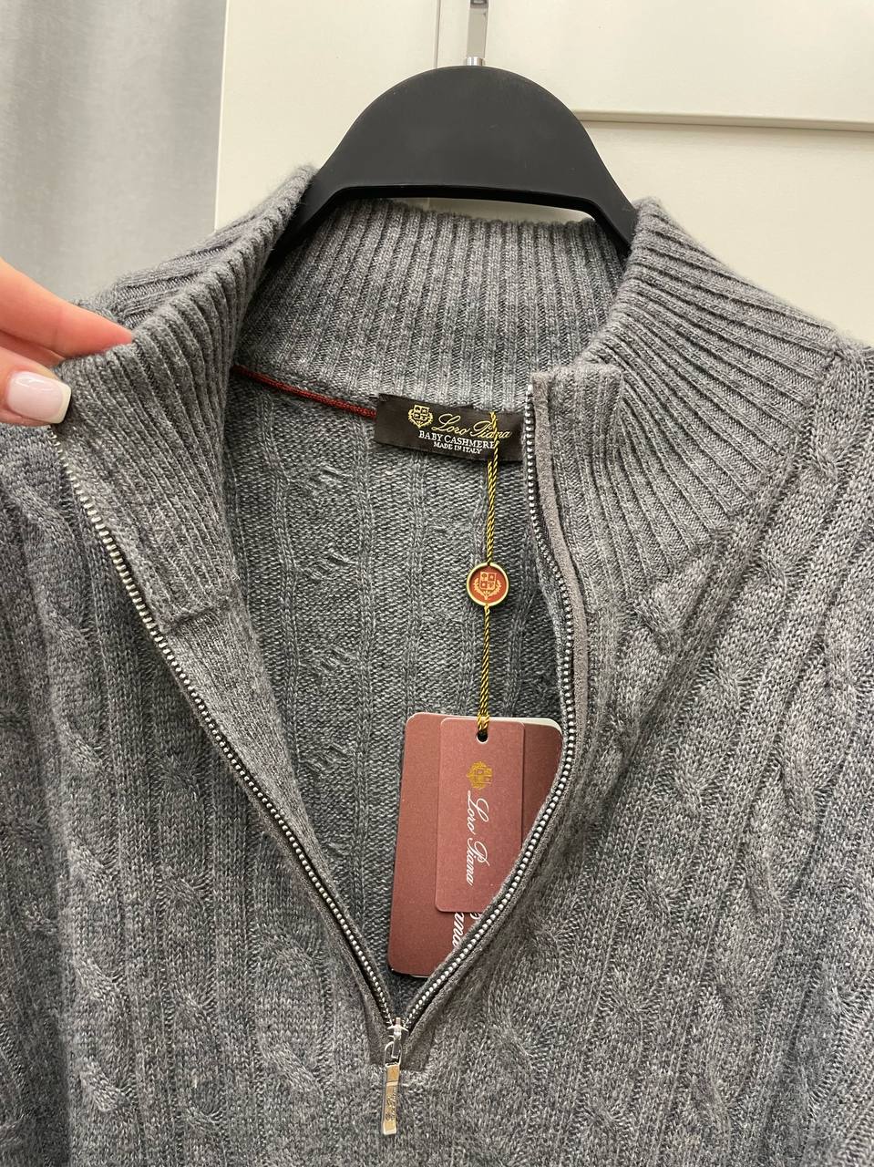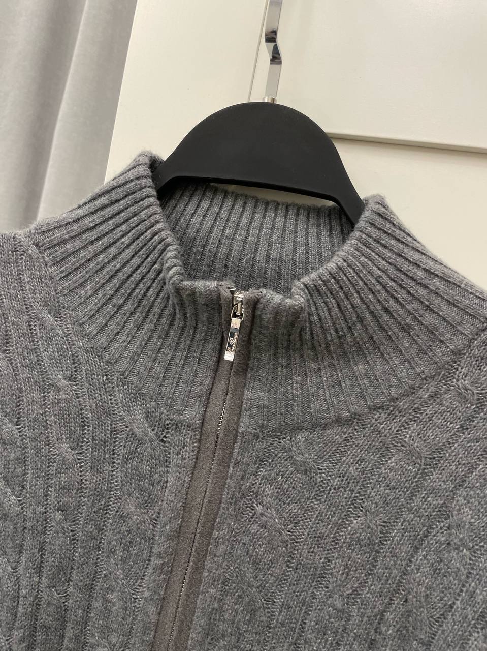 Свитер мужской Loro Piana LUX-101676, представленный на изображении, – это стильный предмет гардероба для мужчин. Свитер выполнен в классическом стиле с воротником-стойкой на молнии и имеет серый цвет. Текстура свитера создает интересный визуальный эффект.