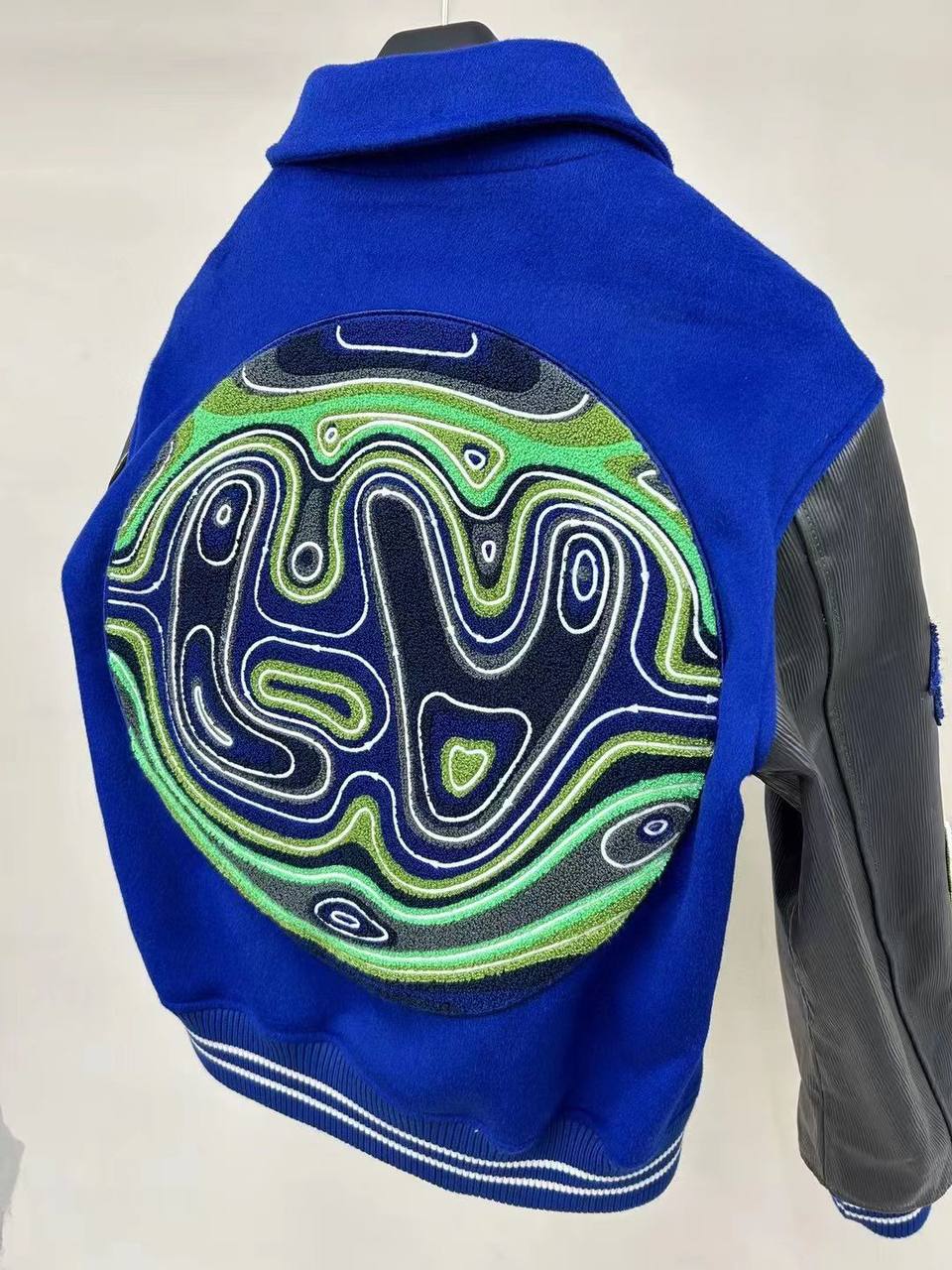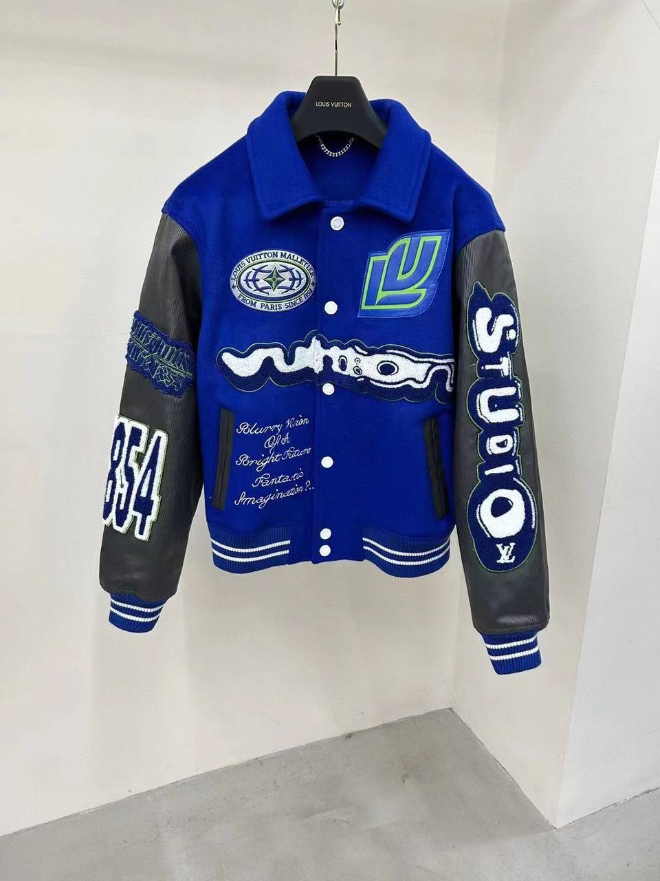 Бомбер Louis Vuitton LUX-96858, представленный на изображении, выполнен в спортивном стиле с элементами американского колледжа. Основной цвет изделия — яркий синий, дополненный контрастными деталями черного и белого цветов. Дизайн бомбера украшен нашивками и вышивкой, делая его выразительным элементом гардероба.