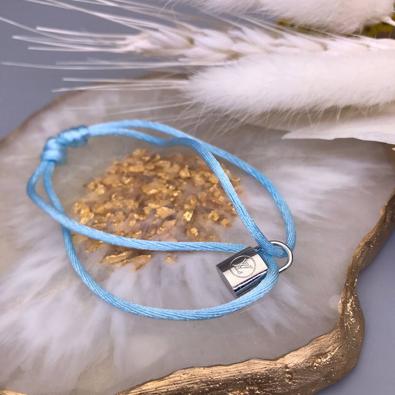 Браслет Louis Vuitton LUX-88244 - стильный аксессуар, который подчеркнет индивидуальность. Браслет выполнен в нежно-голубом цвете с серебристой фурнитурой в виде замочка. Этот браслет может стать отличным дополнением к повседневному образу.
