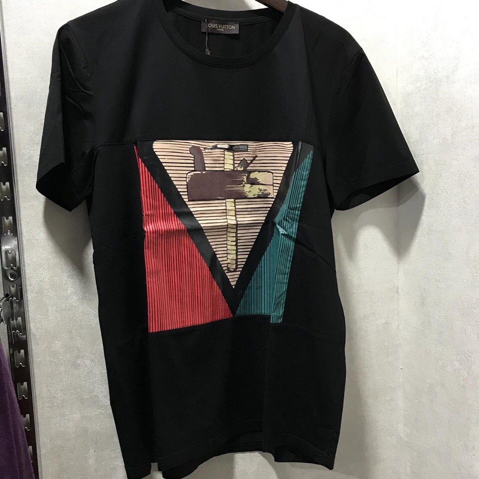 Эта футболка Louis Vuitton ОДМ-001 представляет собой стильное и современное решение для мужского гардероба. Черная основа модели дополнена ярким геометрическим принтом в виде треугольника, внутри которого изображен стилизованный чемодан. Принт выполнен в технике колор-блокинг, с использованием красных, зеленых и бежевых оттенков, создавая динамичный и запоминающийся образ. Футболка отлично подойдет как для повседневных выходов, так и для создания более формальных образов в сочетании с пиджаком или джинсовой курткой.