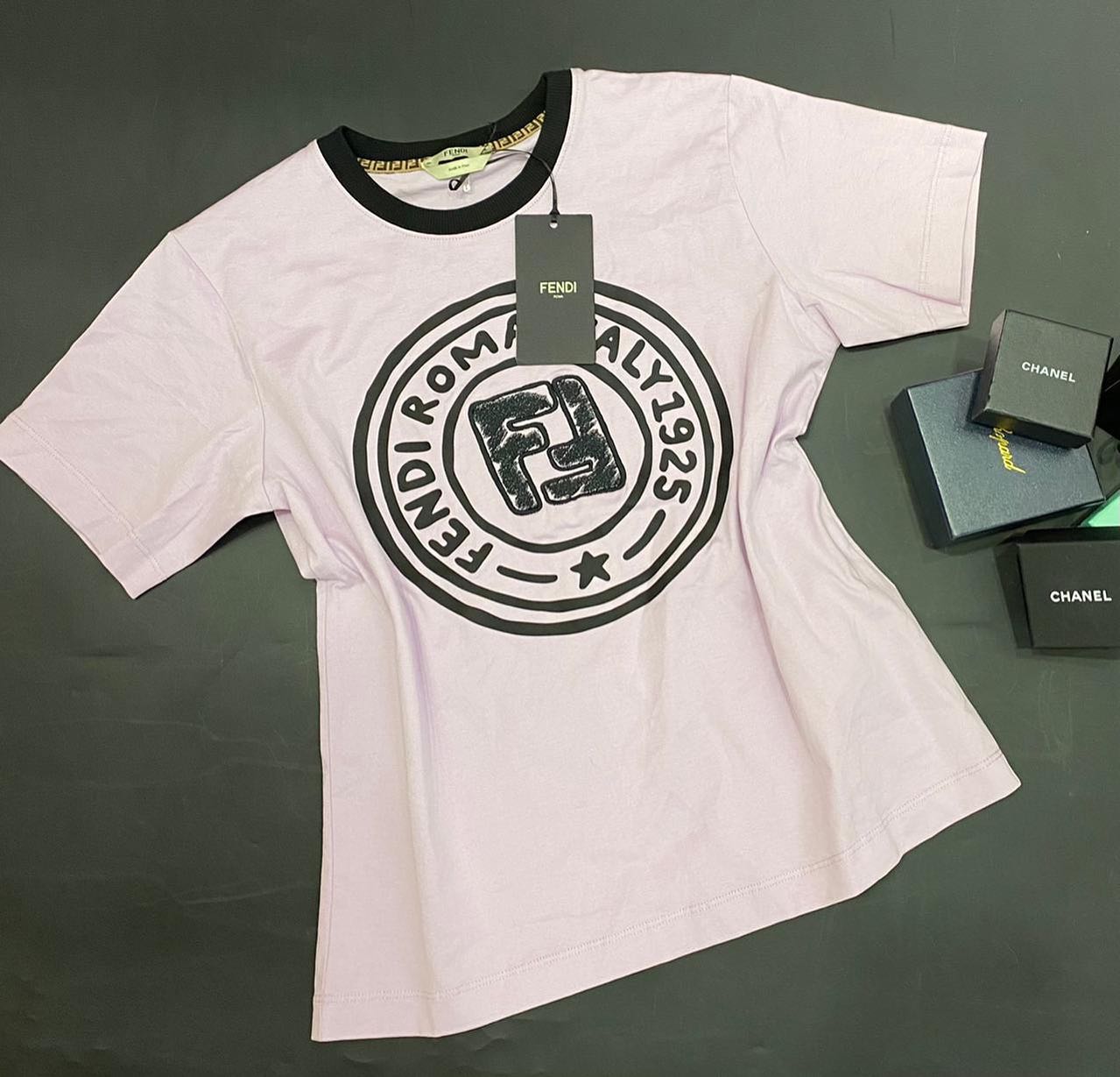 Футболка Fendi LUX-43581 представляет собой стильный элемент повседневного гардероба, выполненный в лавандовом цвете. Она украшена узнаваемым логотипом Fendi в виде двойной буквы "F", расположенным в центре круглого принта с надписями "FENDI ROMA" и "ITALY1925". Черная окантовка горловины и контрастный принт придают изделию выразительность. Эта футболка идеально подойдет для создания непринужденных, но элегантных образов.