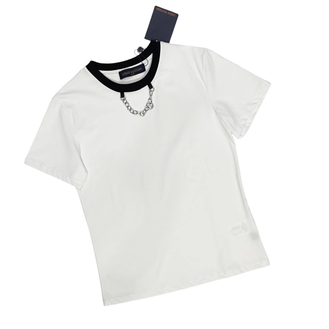 Футболка Louis Vuitton LUX-110074 – это стильный предмет гардероба от известного бренда. Классическая белая футболка с короткими рукавами и черным воротником, украшенная цепочкой, придаст образу современный вид. Идеально подходит для создания повседневных и модных образов.