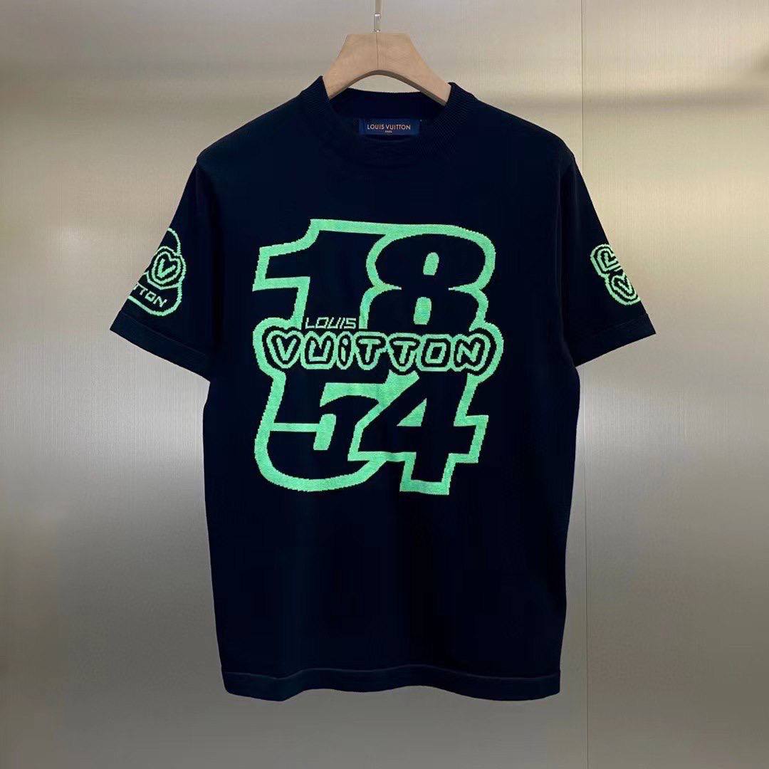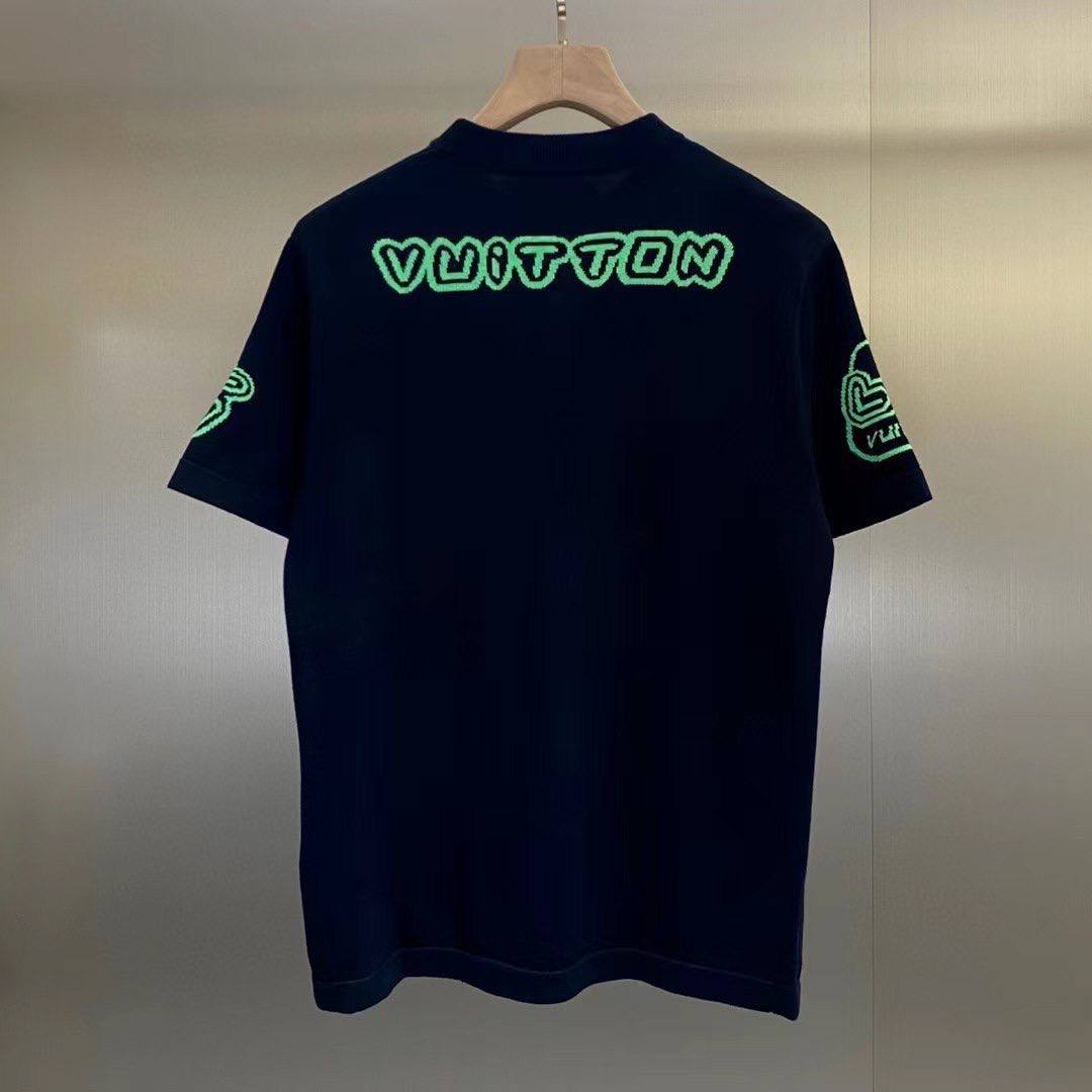 Футболка Louis Vuitton LUX-86520 выполнена в спортивном стиле. Черный цвет футболки дополняется ярким неоново-зеленым принтом спереди, а также фирменным логотипом бренда на рукаве. Эта футболка станет отличным дополнением к повседневному образу.