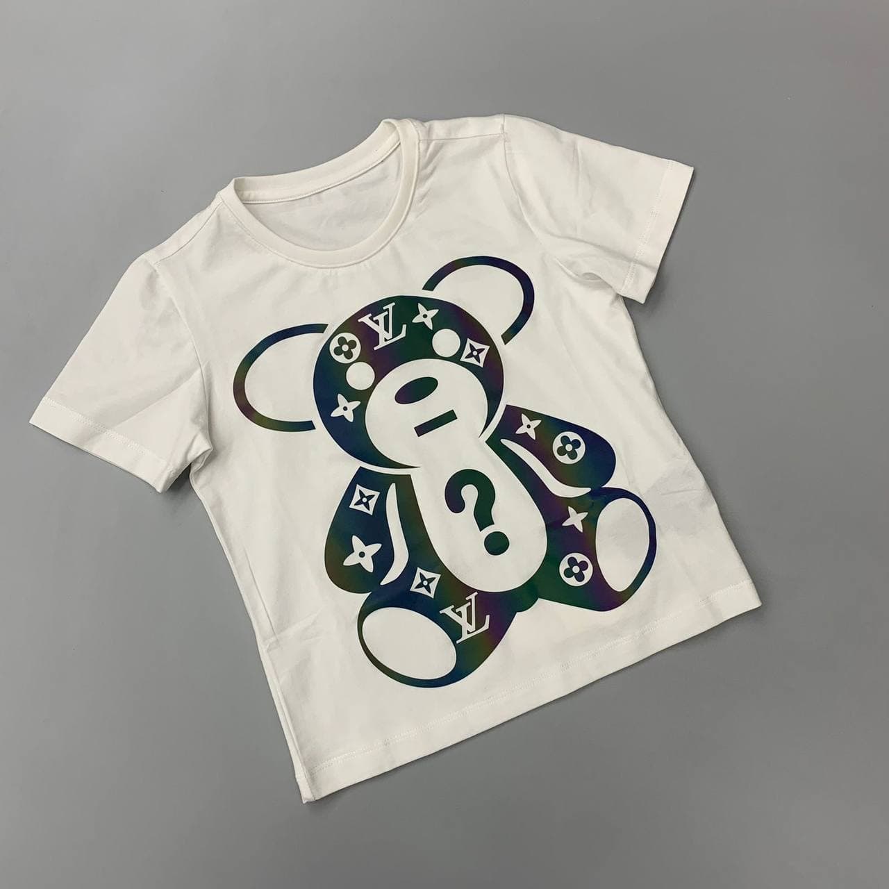 Эта футболка Louis Vuitton LUX-64188 выполнена в стиле унисекс, идеально подходящей для повседневных образов. Белый цвет футболки контрастирует с ярким принтом в виде стилизованного медвежонка, выполненного в технике градиентной печати, добавляя оригинальности. Футболка дополнена классическим круглым вырезом и короткими рукавами, что делает ее удобной и практичной.
