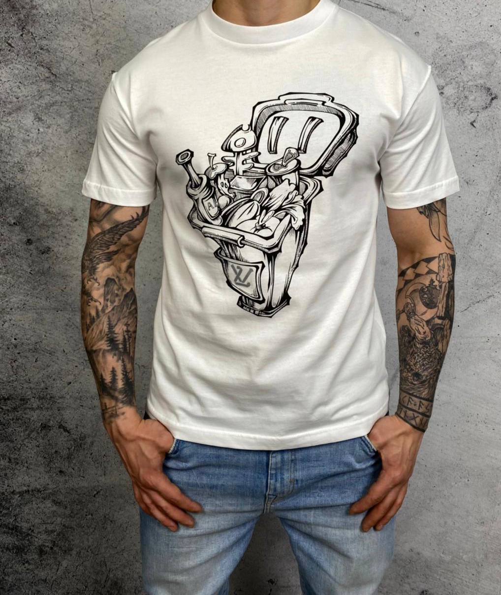 Эта белая футболка Louis Vuitton с артикулом LUX-49758 представляет собой стильное решение для ценителей современного дизайна. На груди футболки расположен оригинальный черно-белый принт, выполненный в стиле граффити, который придает изделию узнаваемый характер. Она идеально подойдет для создания непринужденных повседневных образов.