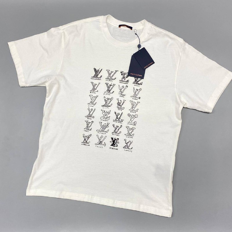 Футболка Louis Vuitton LUX-53193 — это стильное и оригинальное изделие, отражающее креативный подход бренда. Белый цвет и лаконичный крой делают ее универсальной основой для множества образов. На переднем плане футболки расположена уникальная графика, представляющая собой различные вариации логотипа Louis Vuitton, обыгранные в разнообразных формах и сопровождаемые подписями.
