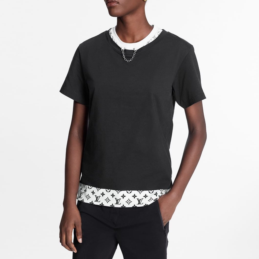 Эта футболка Louis Vuitton LUX-42262 представляет собой стильное решение для создания современных образов. Модель выполнена в черном цвете и имеет оригинальный дизайн с имитацией двух слоев одежды, что добавляет ей уникальности. По нижнему краю футболки проходит контрастная белая полоса с фирменным монограммным принтом Louis Vuitton, а на воротнике расположена декоративная цепочка, подчеркивающая элегантность изделия.