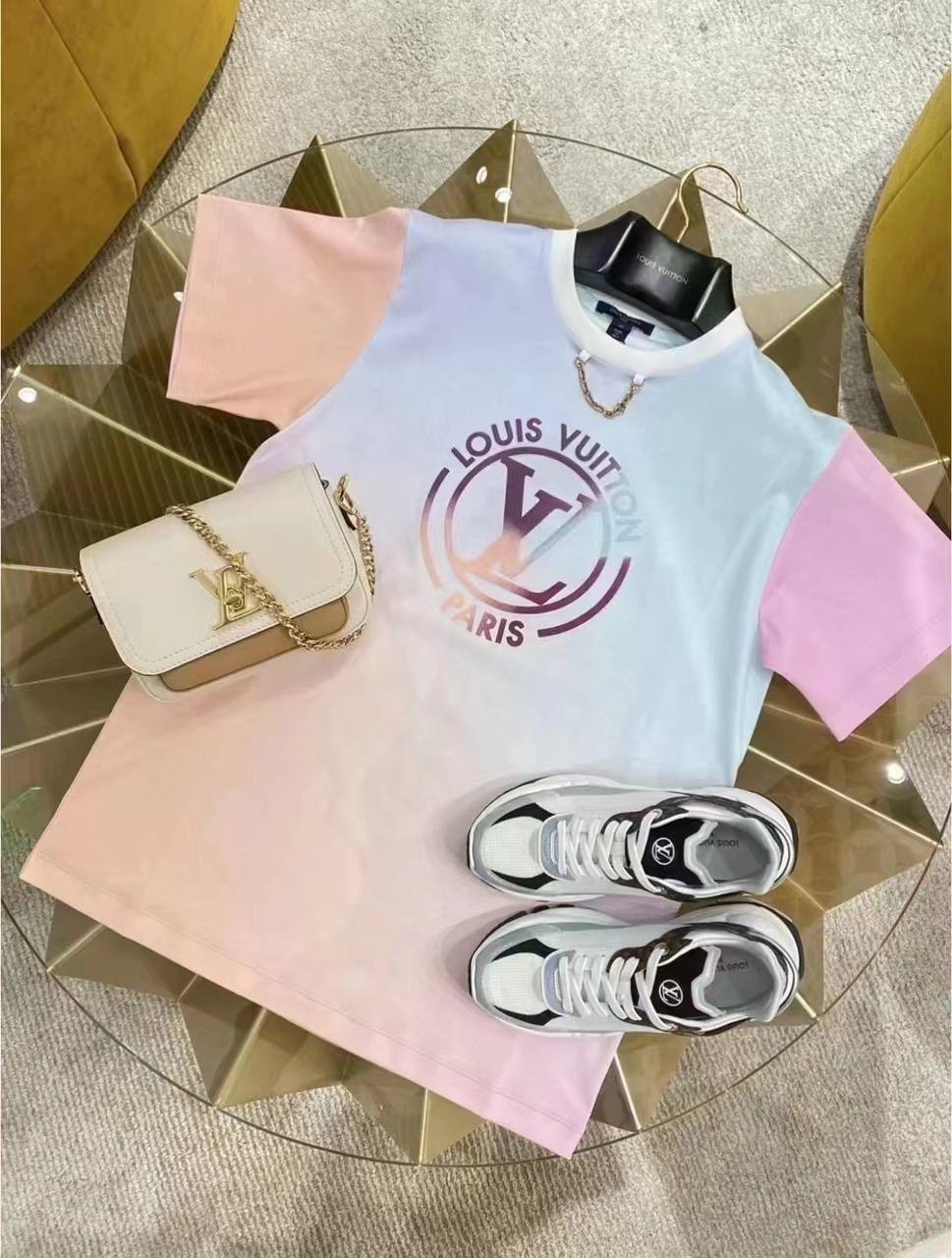 Футболка Louis Vuitton LUX-68540 — это стильный элемент гардероба, выполненный в современном стиле. Изделие отличается оригинальным градиентным дизайном, переходящим от светло-голубого к нежно-розовому, и украшено узнаваемым логотипом бренда. Эта футболка идеально подойдет для создания непринужденных и модных образов.