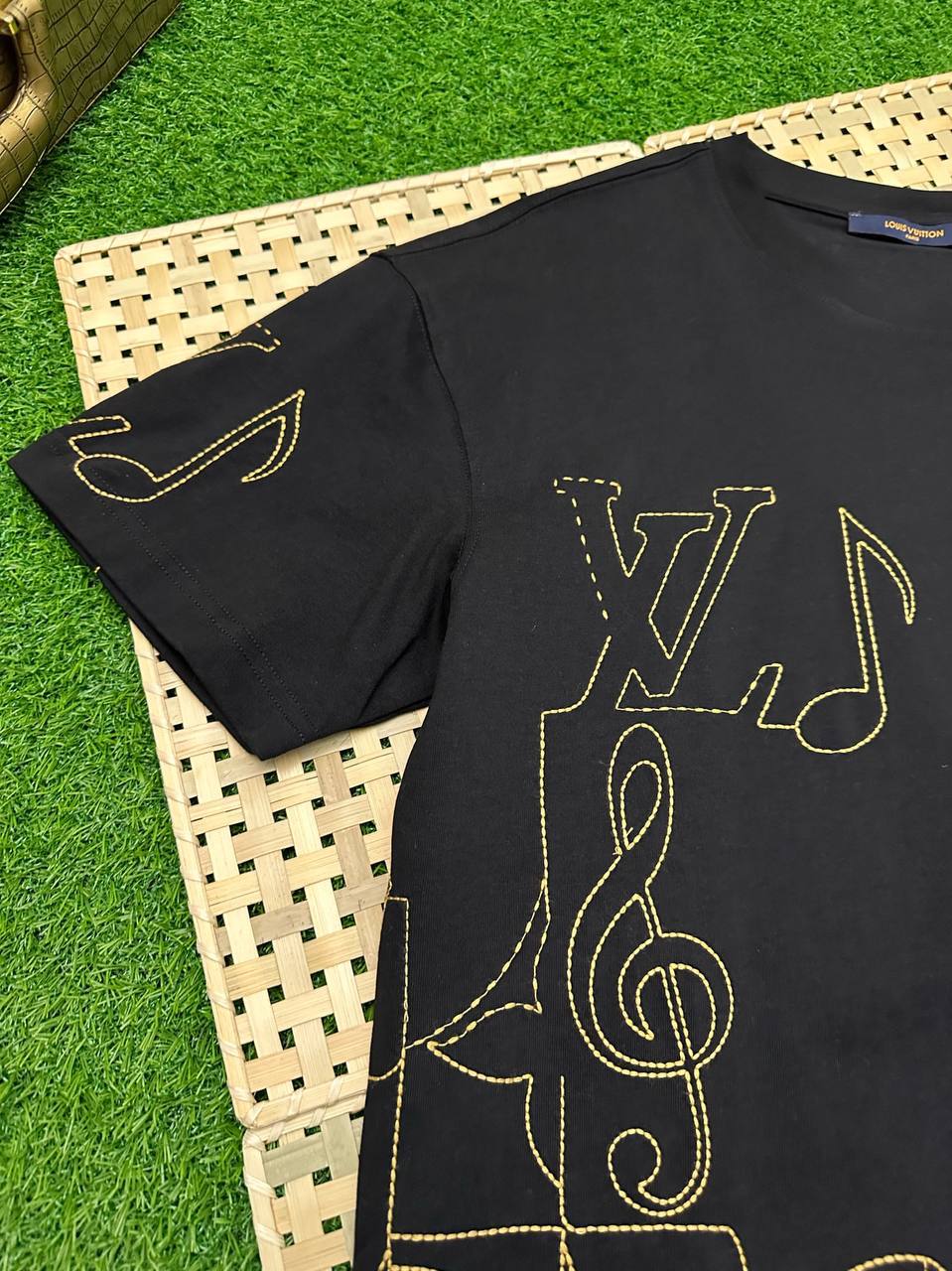 Футболка мужская Louis Vuitton LUX-85861 - это стильный предмет гардероба от известного бренда. Черная футболка с золотистой вышивкой, отражающей музыкальные ноты и логотип бренда, создает эффектный и запоминающийся образ. Эта футболка подойдет для создания как повседневных, так и более формальных образов.