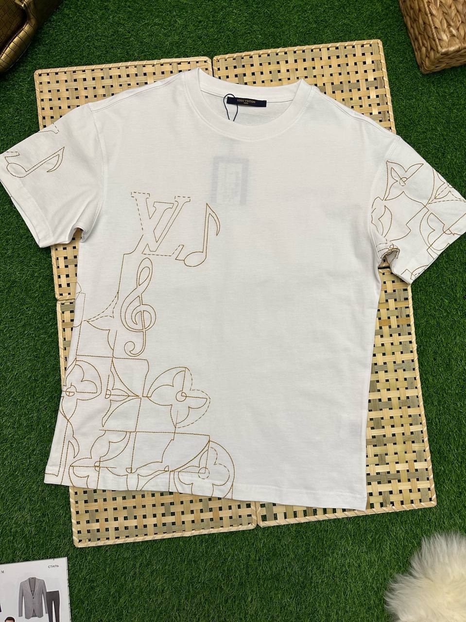Футболка мужская Louis Vuitton LUX-85862 выполнена в классическом стиле. Она представлена в белом цвете с оригинальным дизайном в виде контурной вышивки, которая охватывает левую часть футболки и плечо. Такая футболка идеально подойдет для повседневного гардероба.