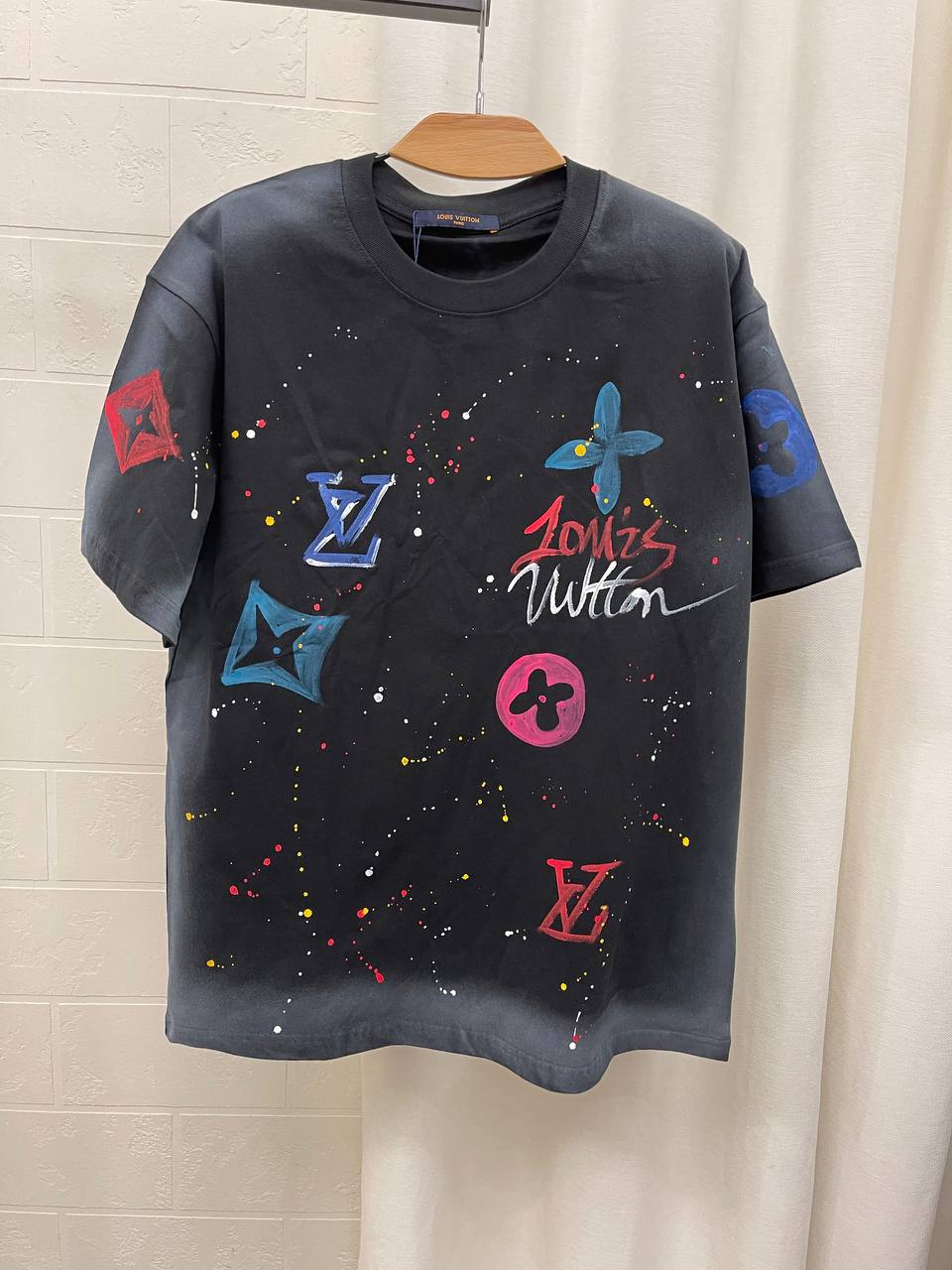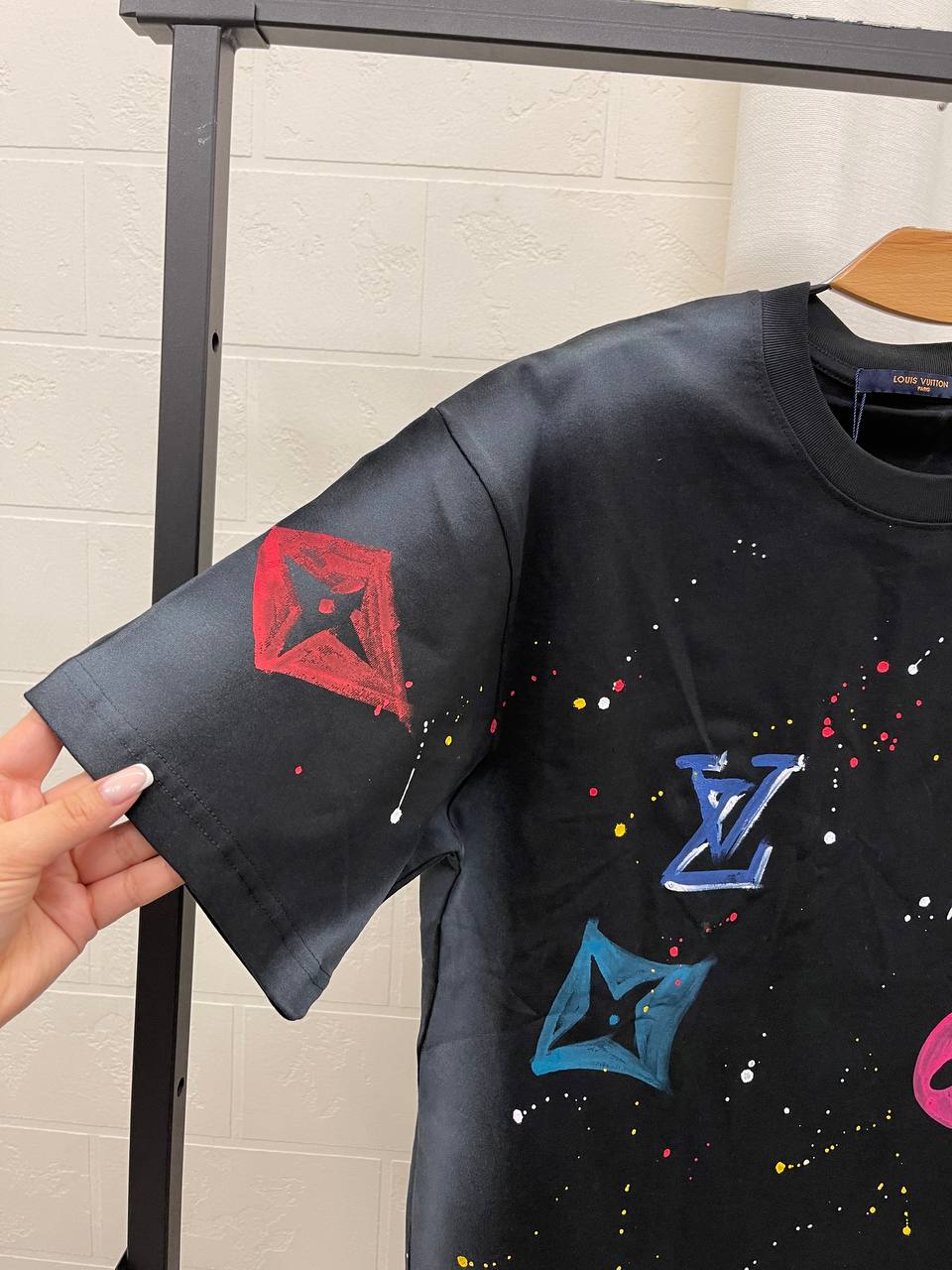 Футболка мужская Louis Vuitton LUX-101736 представляет собой стильный предмет гардероба от известного бренда. Футболка выполнена в свободном стиле с ярким и оригинальным принтом, добавляющим образу индивидуальности. Темный цвет футболки служит отличным фоном для цветных элементов дизайна.